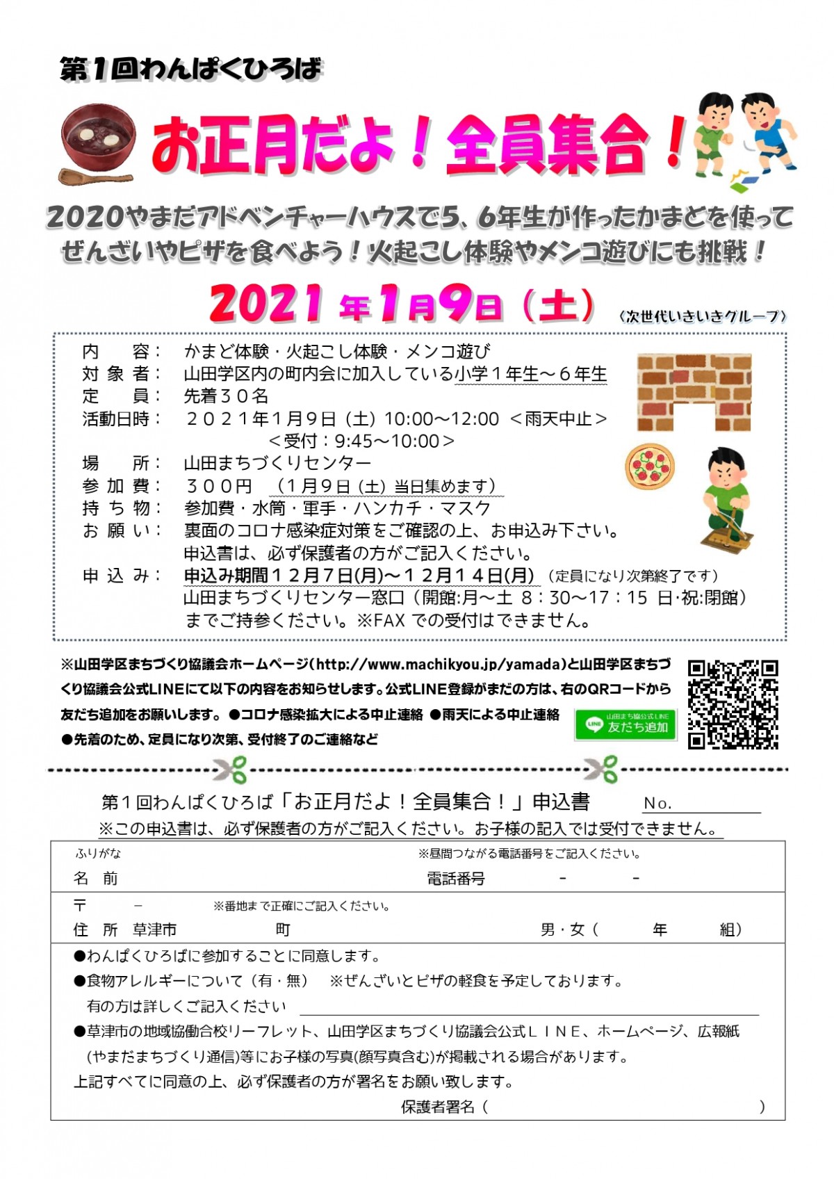 対 象:山田学区内の町内会に加入している小学1年生~6年生 30名(先着)