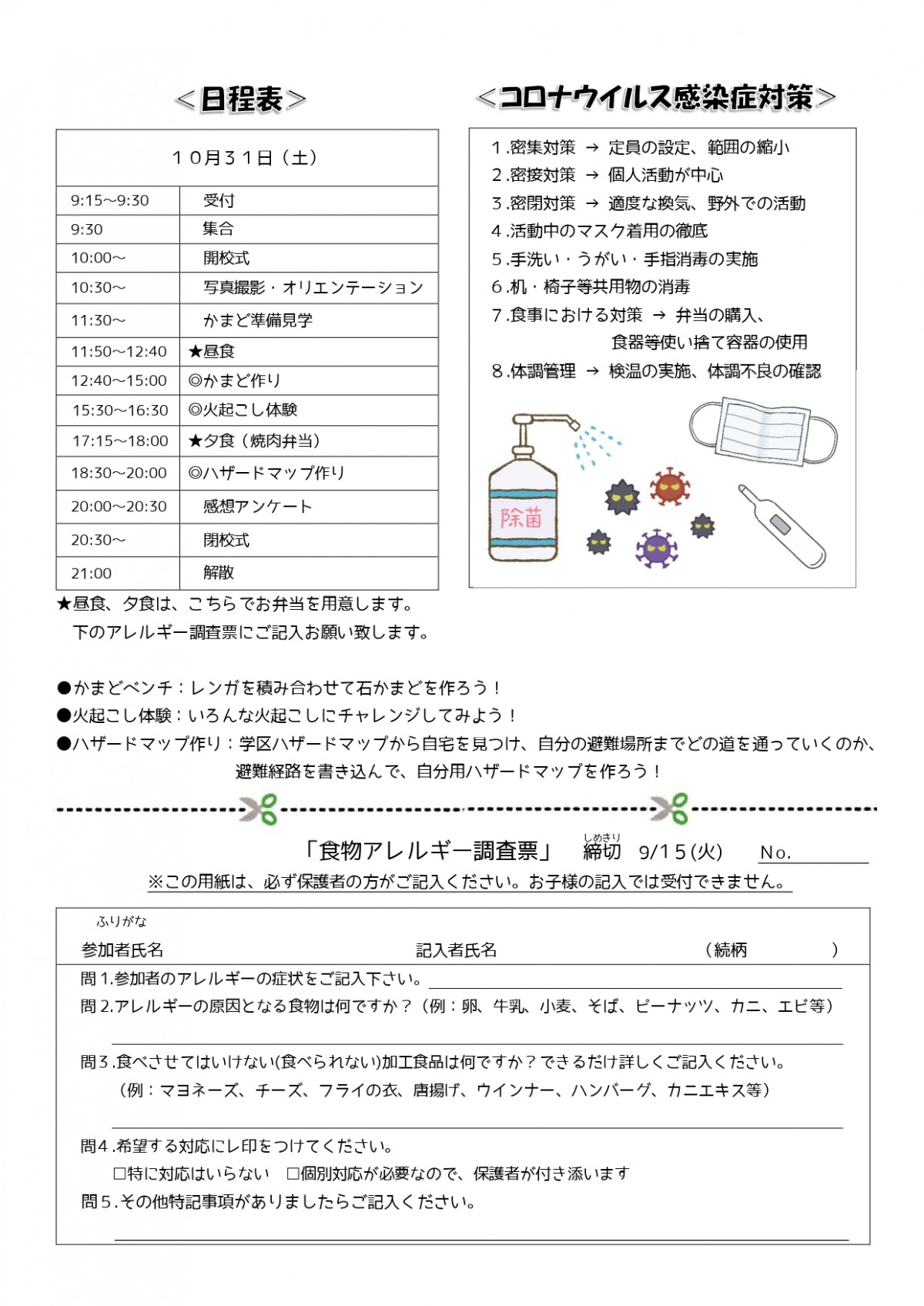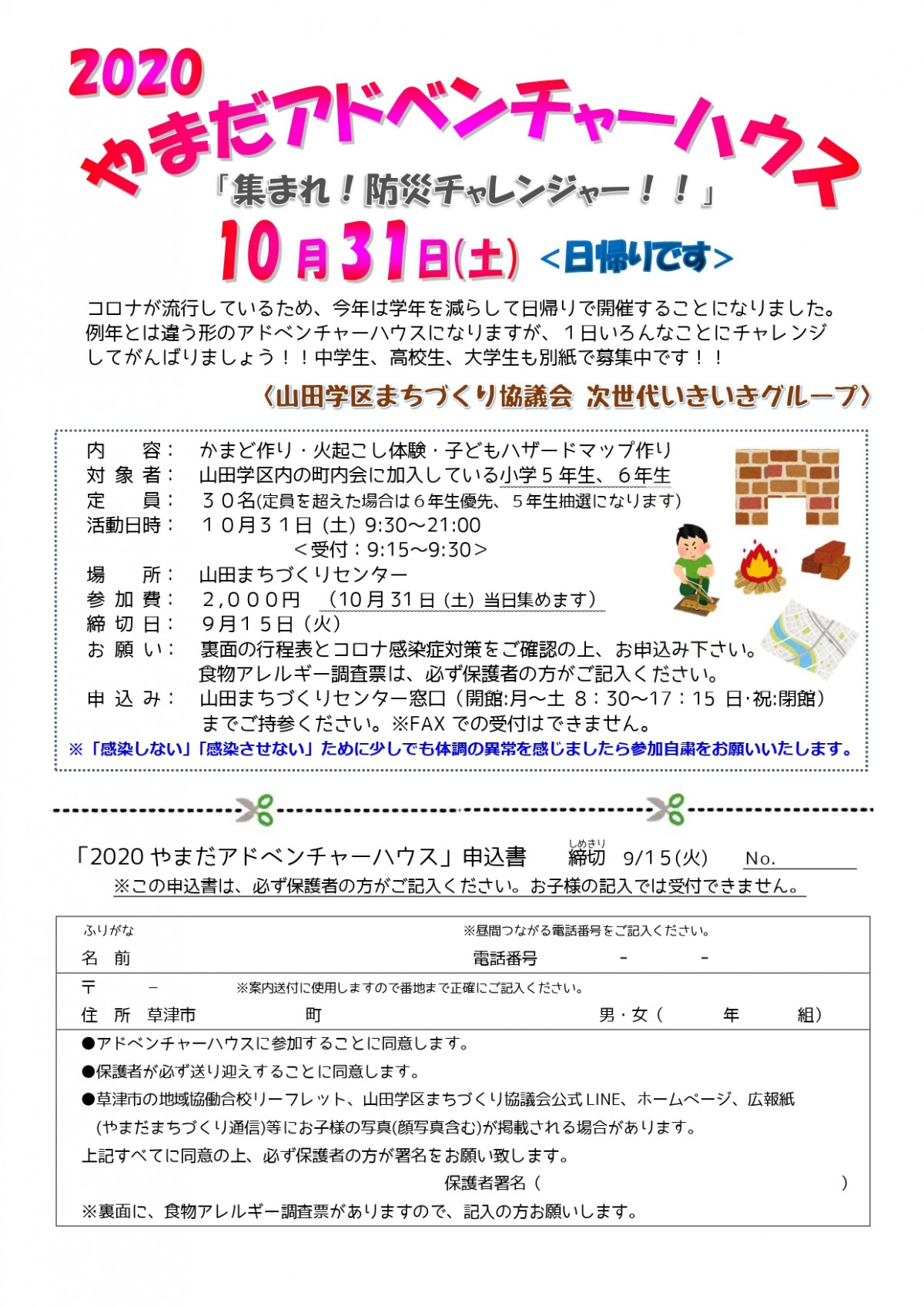 2020やまだアドベンチャーハウス コロナが流行しているため、今年は学年を減らして日帰りで開催することになりました。 開催日時:10月31日(土)9:30~21:00 アドベンチャー日程表とコロナウイルス感染症対策をご確認の上、お申込みください。昼食、夕食はこちらでお弁当を用意します。ご参加お待ちしています。