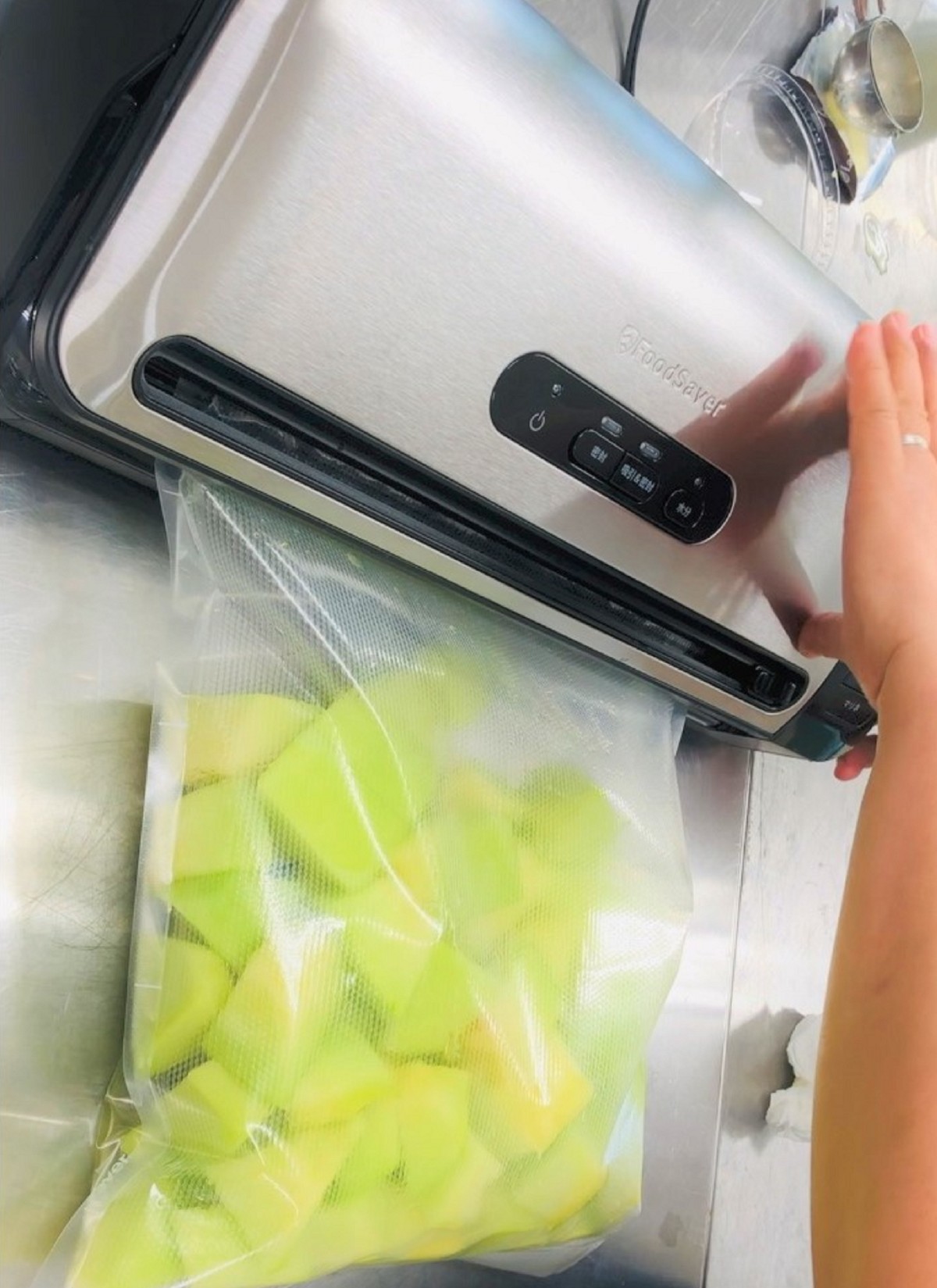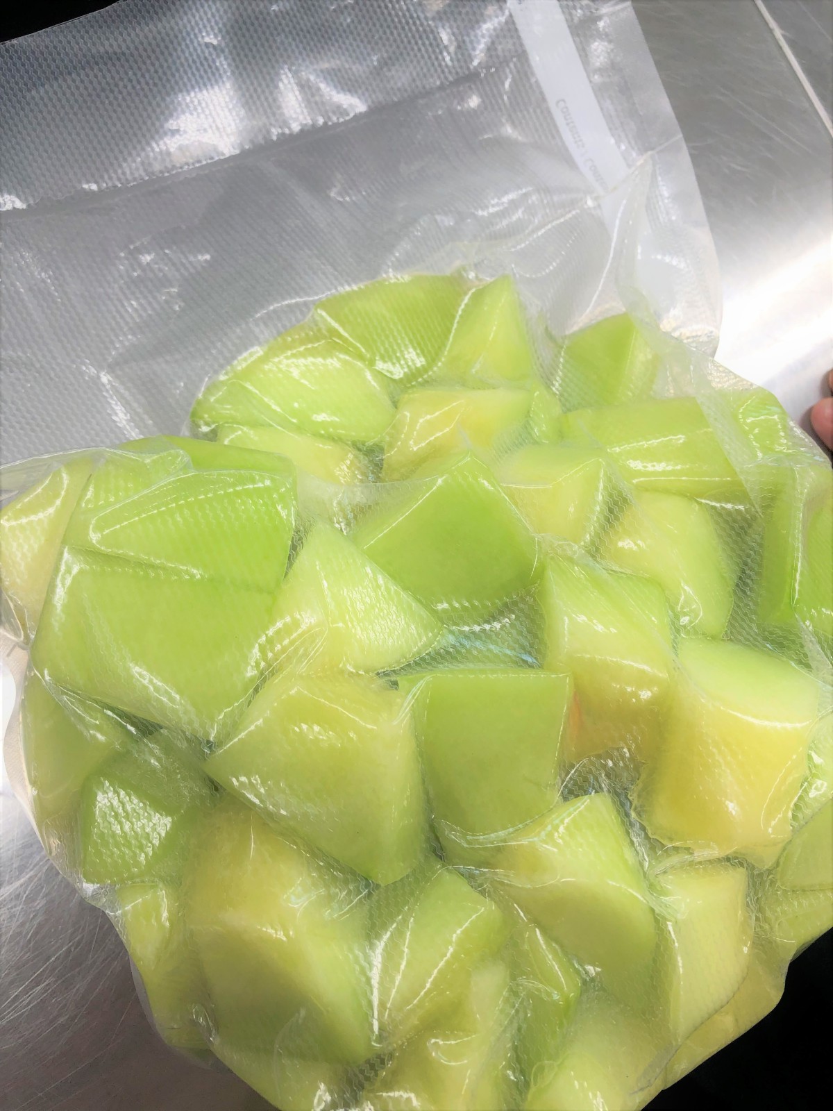 今回、販売日に日程が合わなかった食べ頃メロンをみんなでカットし、真空圧縮して冷凍保存しました。