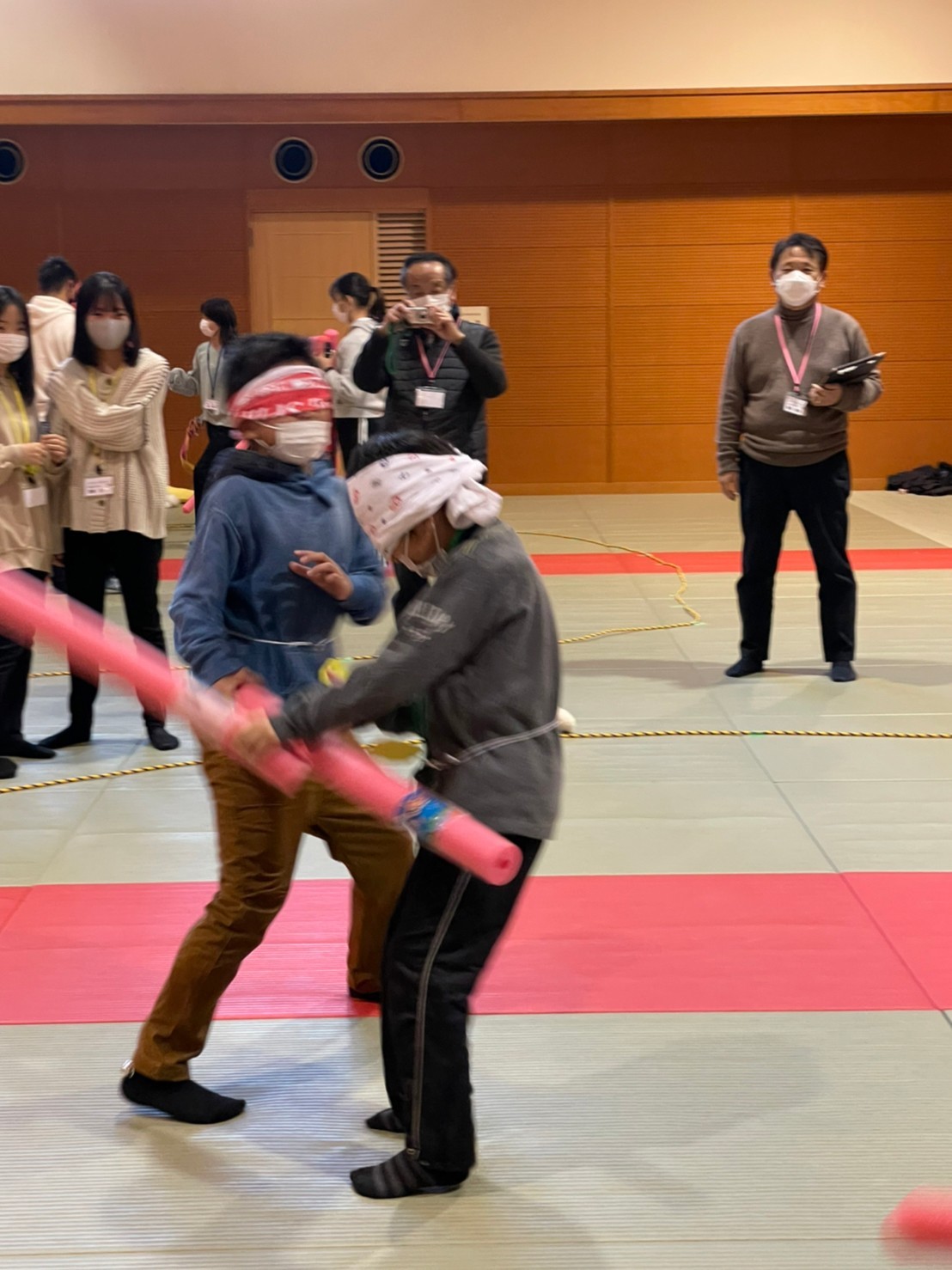 3回当たったら退出して残った人が勝ちです。目隠しせずに新聞風船を付けて戦うのもなかなかGood![]()