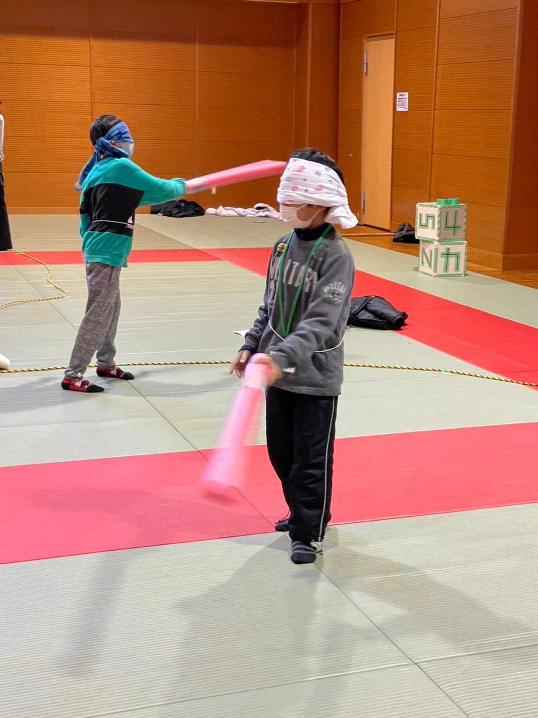 みんな興味津々のチャンバラ、まずは中高生の見本を見学。目隠しをして相手の気配を感じなが、片足に付けた鈴をならさないようにそろ~り、そろ~り