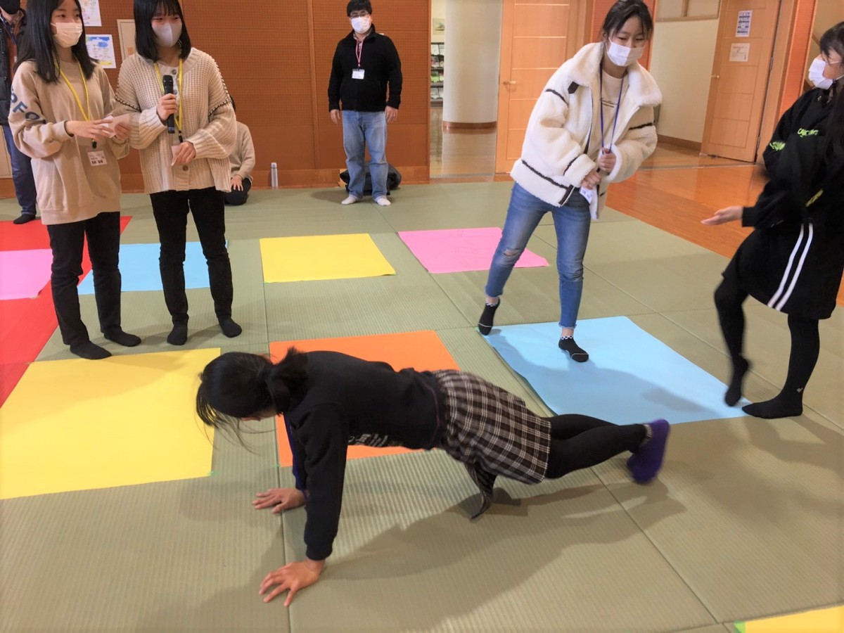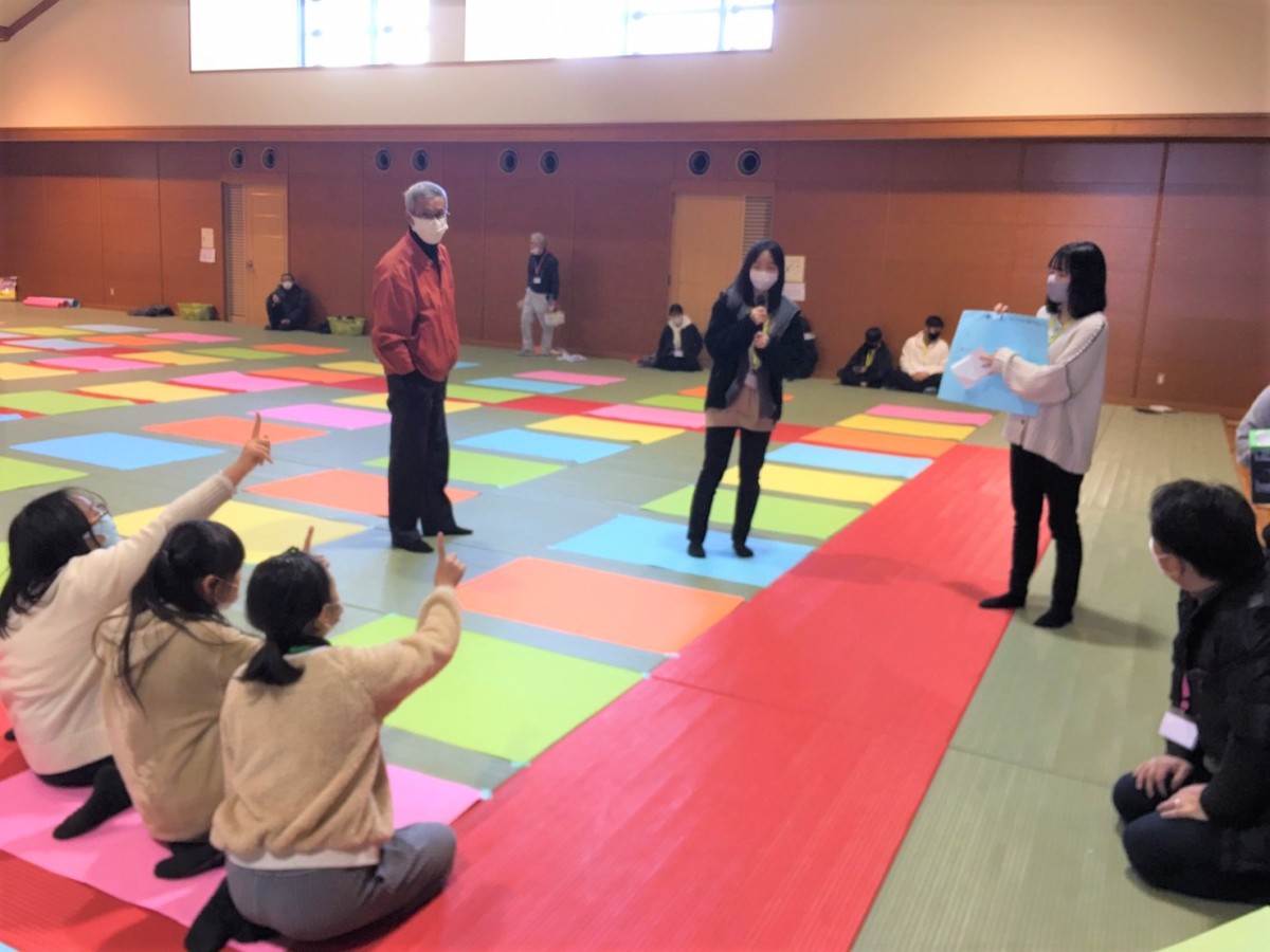 家で考えてきたクイズをそれぞれ紙に書きます。中高生も難しいクイズを考え中。その後、武道館へ移動し、自分がコマになる巨大すごろくを行いました!やわらかマットで作られた巨大サイコロを投げて出た分だけ進みます。止まったマスの色によってクイズやチャレンジを行います。