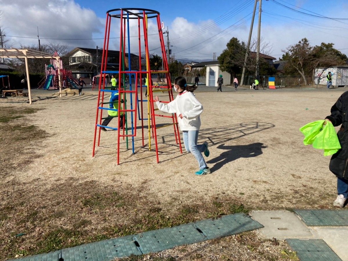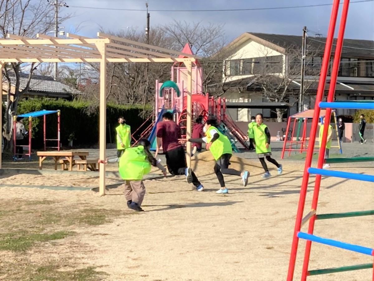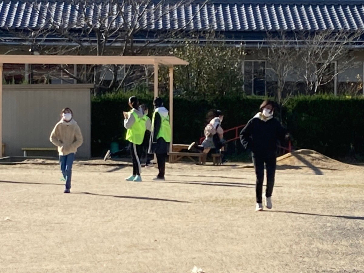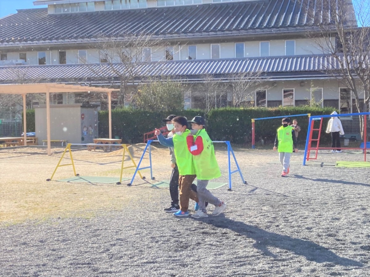 まずは山田こども園でおにごっこ。雪がちらつく寒い日でしたが、走りまくって上着をぬいでがんばってました![]()