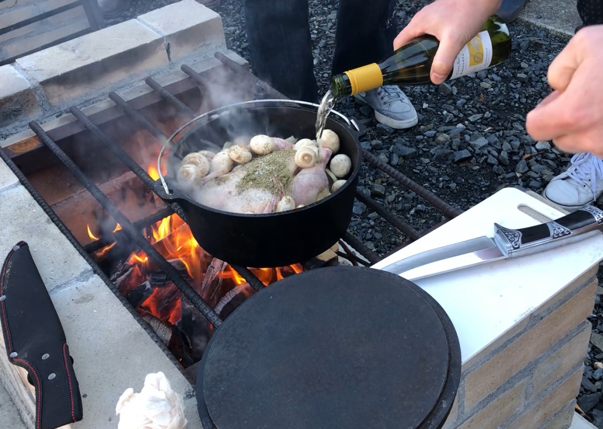 丸ごとチキンと野菜をダッチオーブンに入れ、オリーブオイルで軽く炒め、白ワイン、フランス産の塩が入ったオリジナルスパイスで味付けして煮込みます。さすがダッチオーブン!蓋の上にも炭を乗せ、上からも加熱できます。この合間にもう一つの丸ごとチキンに、これもオリジナルブレンドのスパイスを擦り込み、半分ほど入った缶ビールを下からはめ込んで炭の上にセッティング。外はパリッ、中はビールの蒸気に蒸されてとっても柔らか。だんだん、チキンとワイン、スパイスが混ざったなんとも言えない良い香りが…。頃合いを見て、煮込みチキンの仕上げに生クリーム投入。軽くかき混ぜ、出来上がり!!