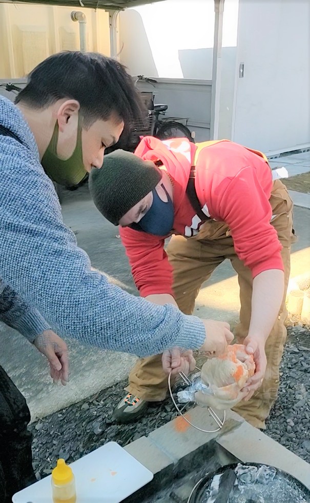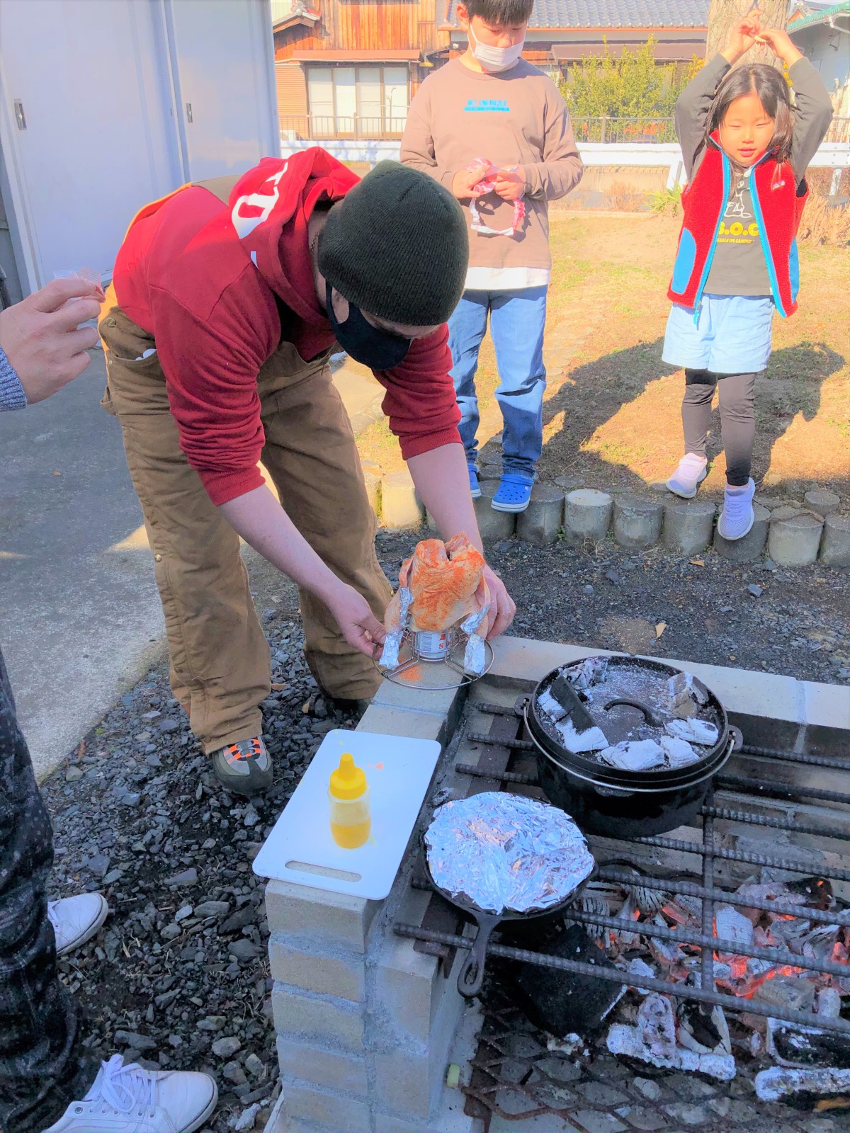 1月8日、ヤマミラ交流の場として気軽に参加できるイベント「かまどで丸ごとチキン」を開催しました。山田まちづくりセンターのかまどで、アクティビティリーダーコリアさんによるワイルドクッキング、丸ごとチキン2種を楽しみました。