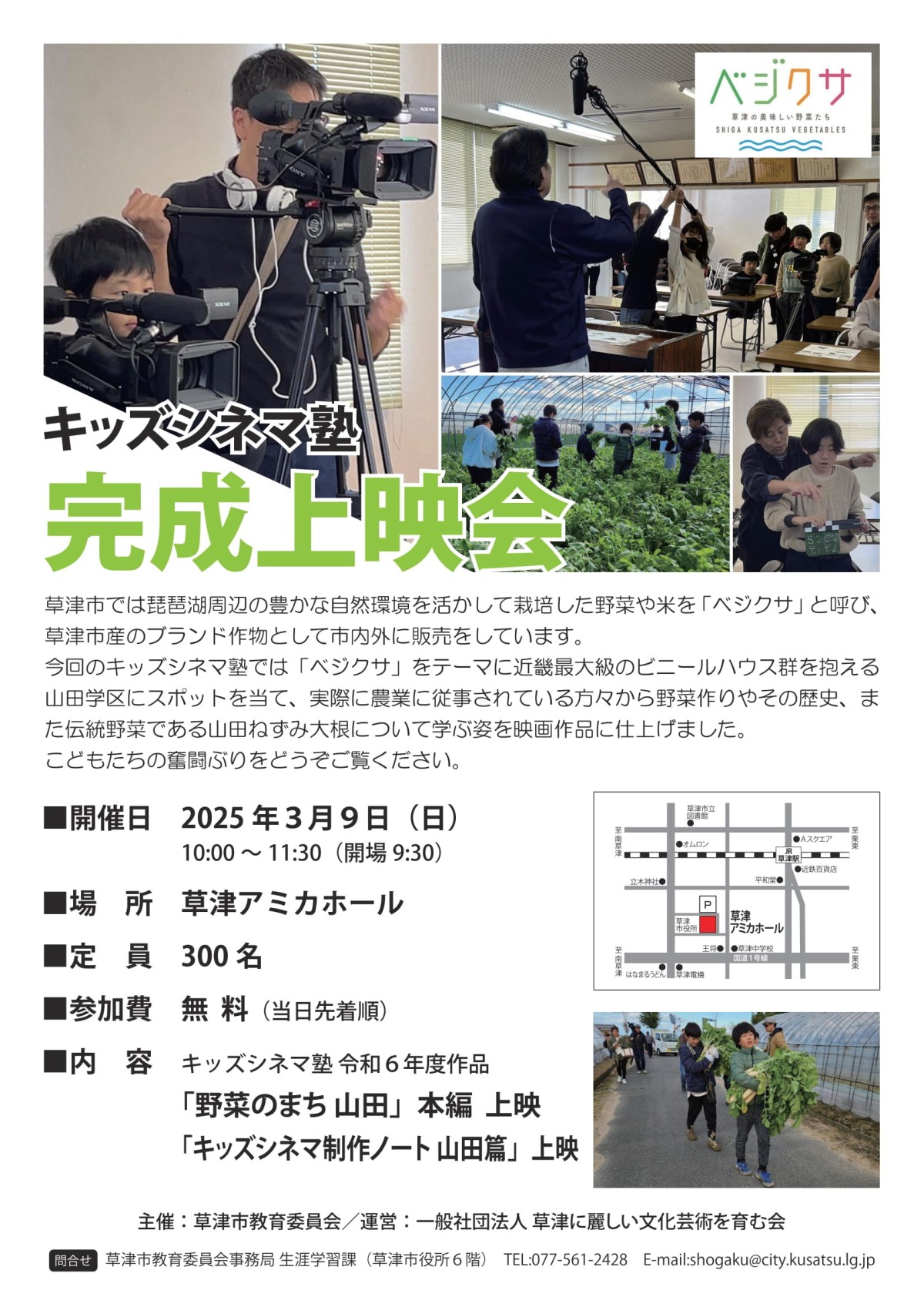 キッズシネマ塾は、映画制作を通じて草津の歴史や文化、魅力に触れることを目的に実施されています。今回は近畿最大級のビニールハウス群を抱える山田学区にスポットを当て実施されました。