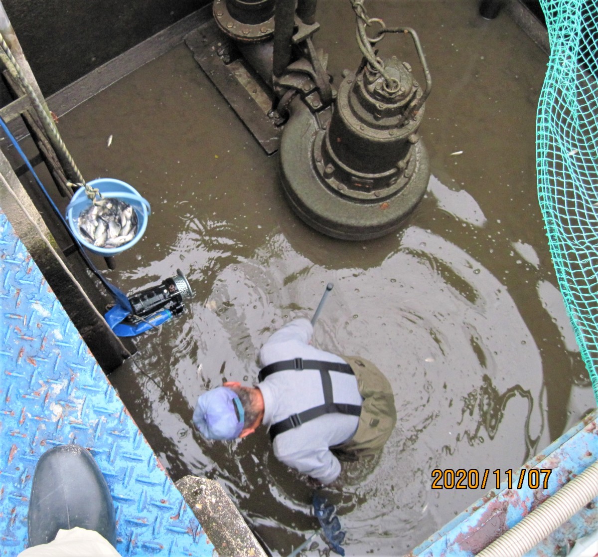外部講師を招き、町内の子どもたちに琵琶湖や近くの河川の魚についての学習会を行いました。十二川ポンプ場を清掃し揚水場にいる魚をすくいあげて観察会の資料としました。揚水場で狭い場所ですが、かなり多くの魚が獲れ、そのほとんどは子フナで鯉の子供やカワムツも混じっていました。ナマズやタナゴ、手長エビなども獲れました。