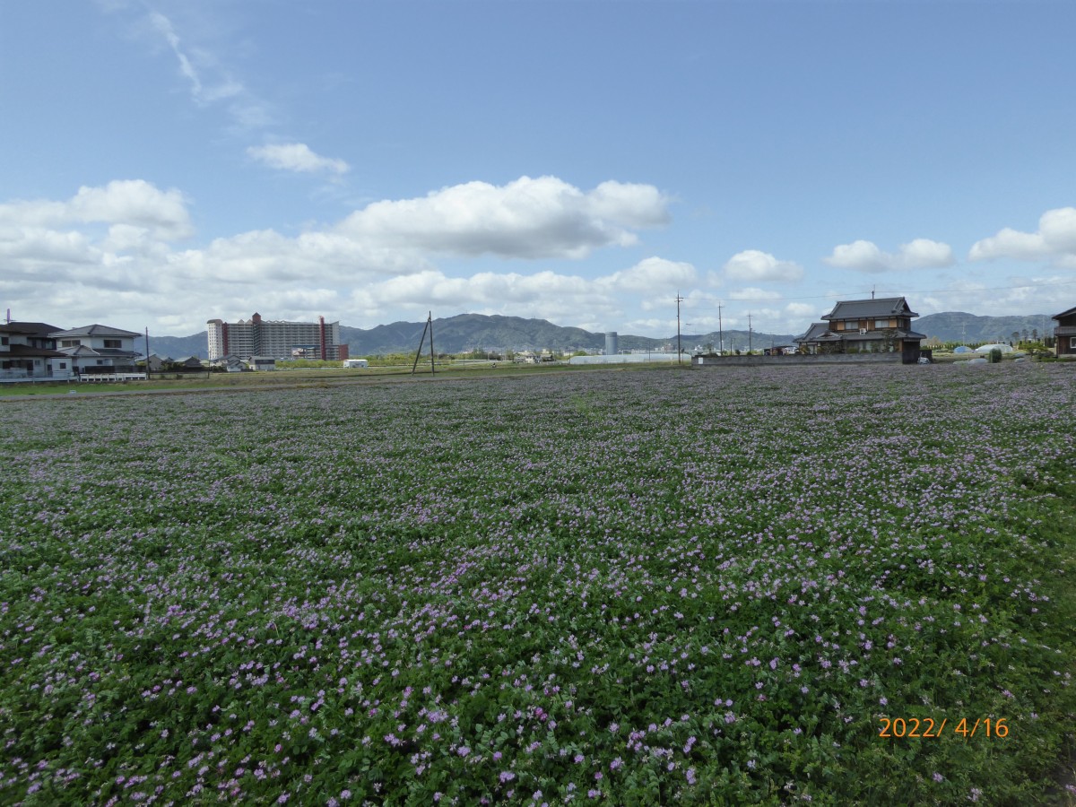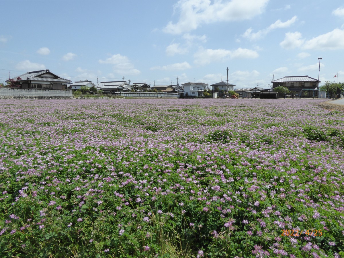 不動浜会館前のレンゲ草が満開で、田んぼ一面をピンク色に染めています!