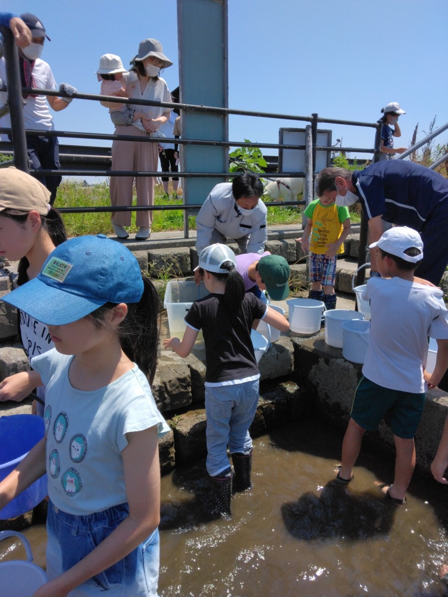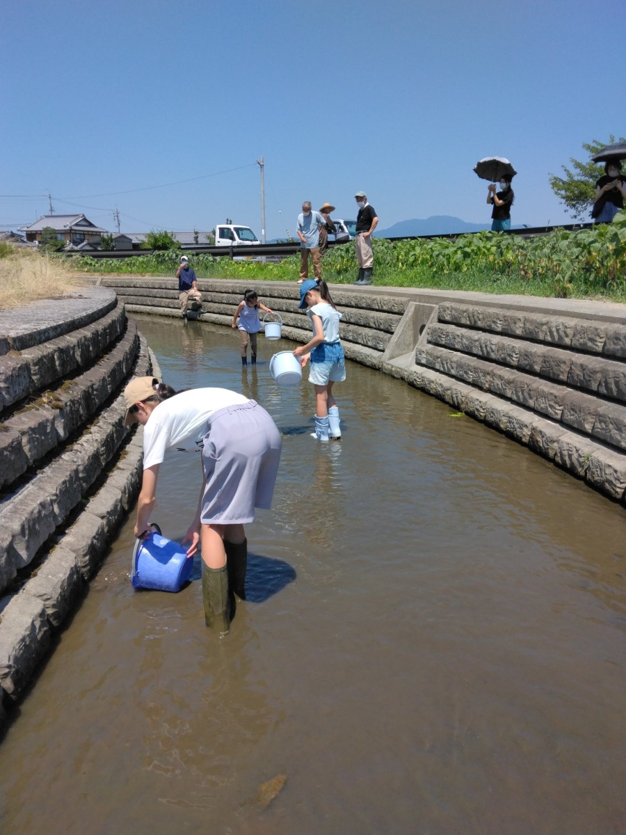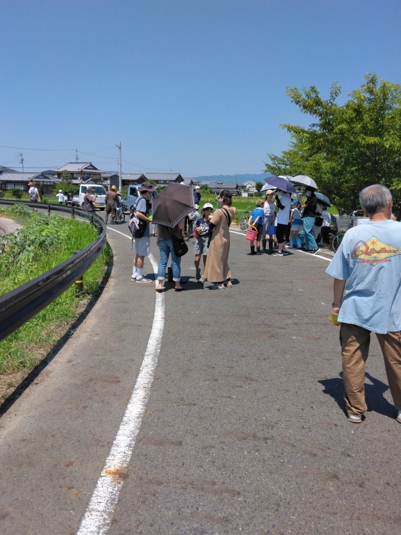 7月2日(土)朝10時30分から、南山田町内を流れる伯母川で二ゴロブナの放流を行いました 晴天に恵まれて34°を超える暑い日でしたが、子供たちは水遊びをしながら2~3センチくらいの二ゴロブナの稚魚を放流しました 全部で5000匹の小さなフナの稚魚が元気一杯に伯母川を泳ぎました 今年の10月頃に大きくなったフナの観察会をする予定です 参加者は、子供会親子連れが25名、ふるさと環境推進会の方々が17名、全部で42名が集まりました 放流のあとフナが大きく育つことを願って解散しました