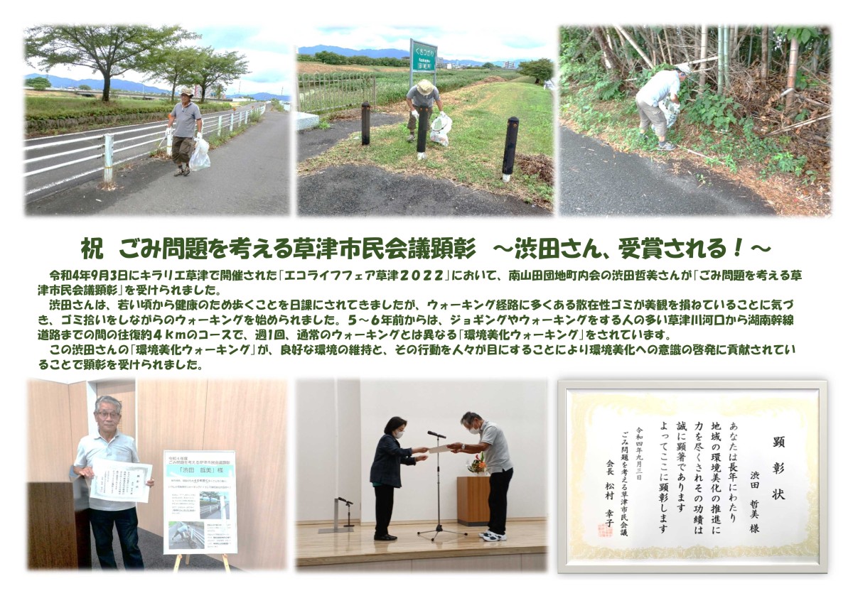 ごみ問題を考える草津市民会議顕彰 南山田団地 渋田さん受賞!
