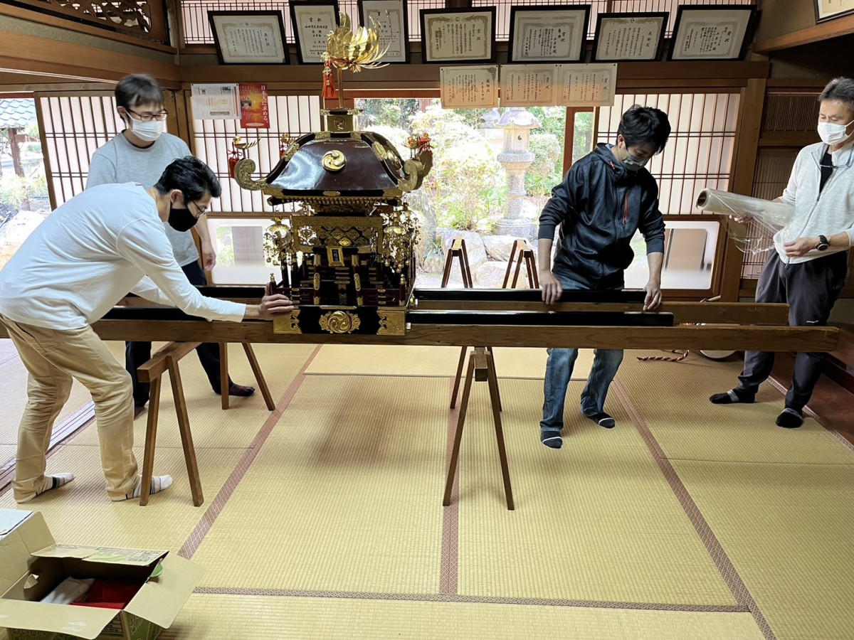 子供会役員の保護者は、前週の4月29日に神輿の組み立てなどの準備をしながら当日の無事を祈りました。その思いが通じたのか、当日は晴天に恵まれ少し汗ばむくらいでした。