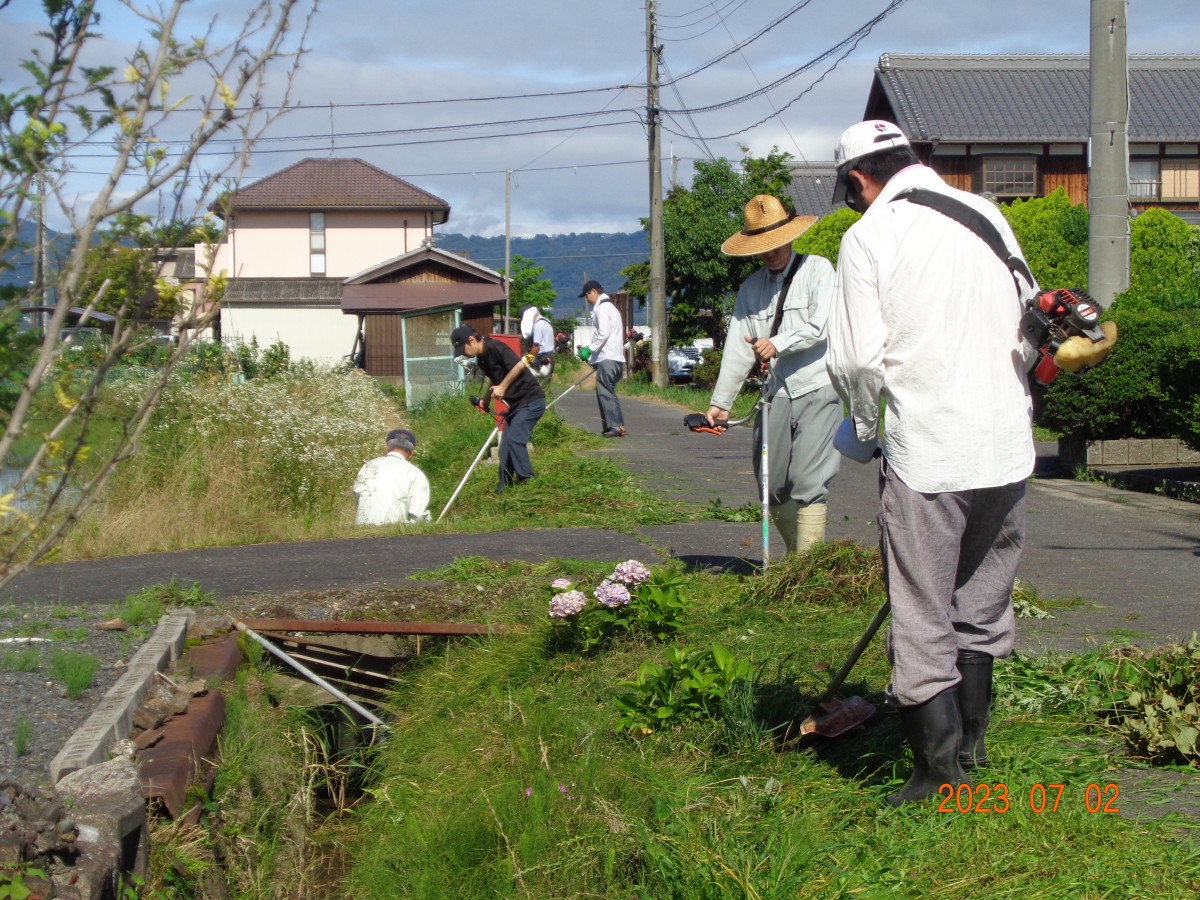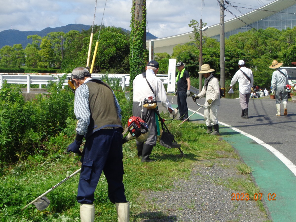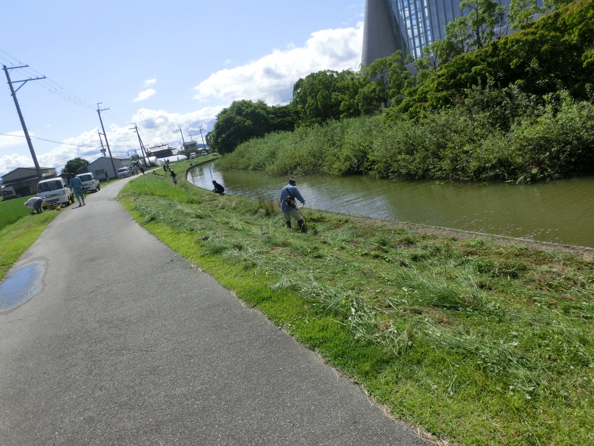 7月2日(日)、「河川愛護草刈り作業」を実施しました。例年のとおり、町内を流れる山寺川周辺を中心に、琵琶湖岸まで作業を行いました。町民の方106名の協力の下、きれいに除草できました。
