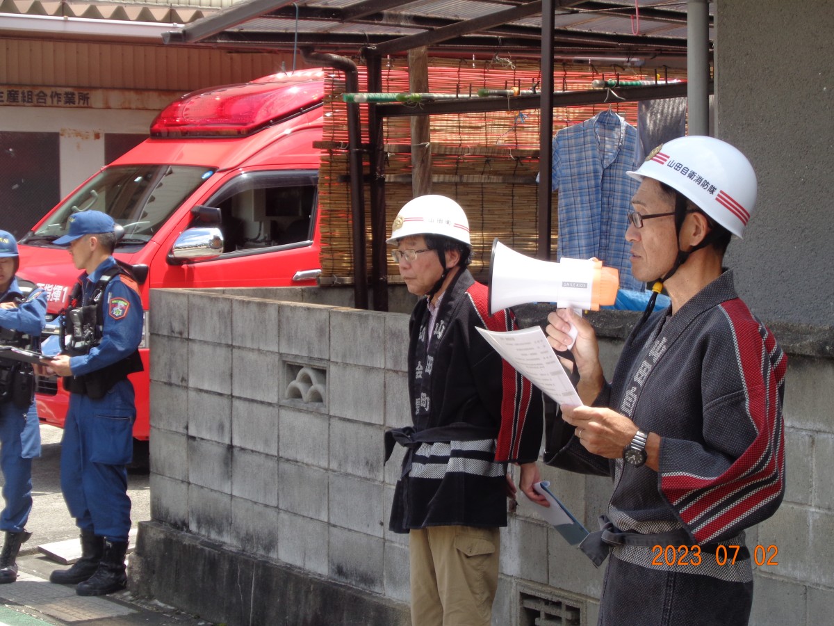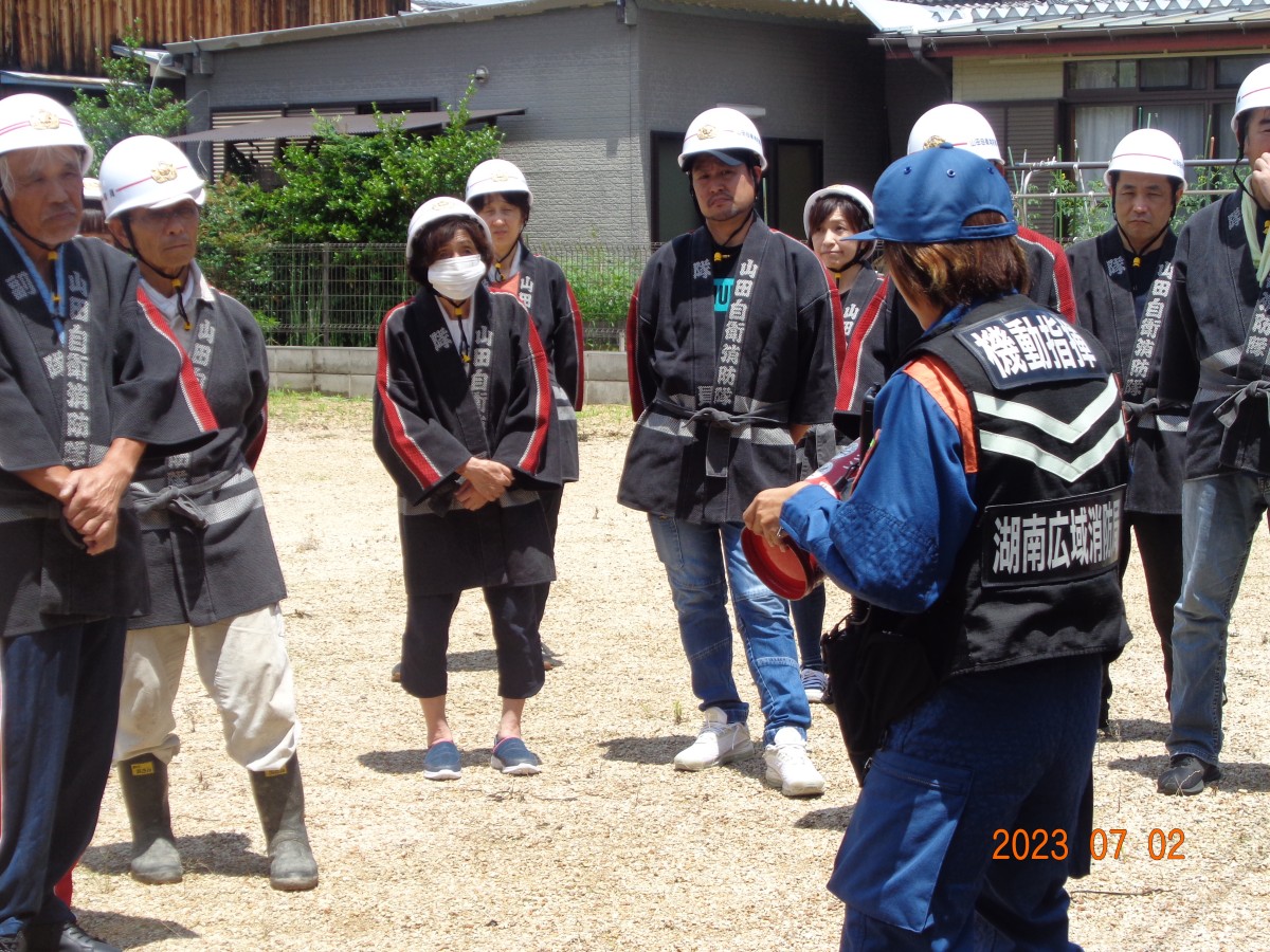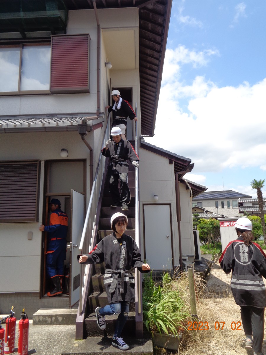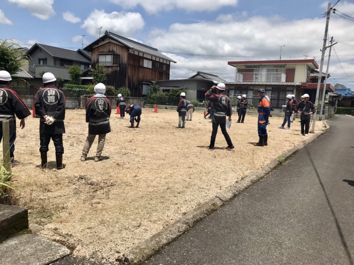 7月2日(日)、草刈り作業後に「防災訓練」を行いました。西消防署の協力を得て、自衛消防隊および町役員合わせて34名が参加しました。自治会館からの出火を想定し、「速やかに避難する」、「初期消火の仕方を理解する」の2点をめあてに行いました。