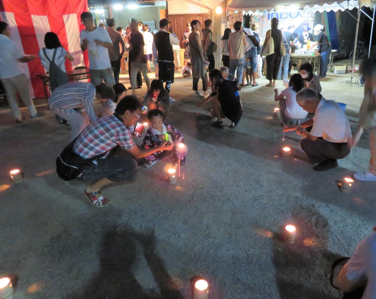 会場一面に竹灯籠をちりばめ、竹灯籠のローソクで線香花火に点火