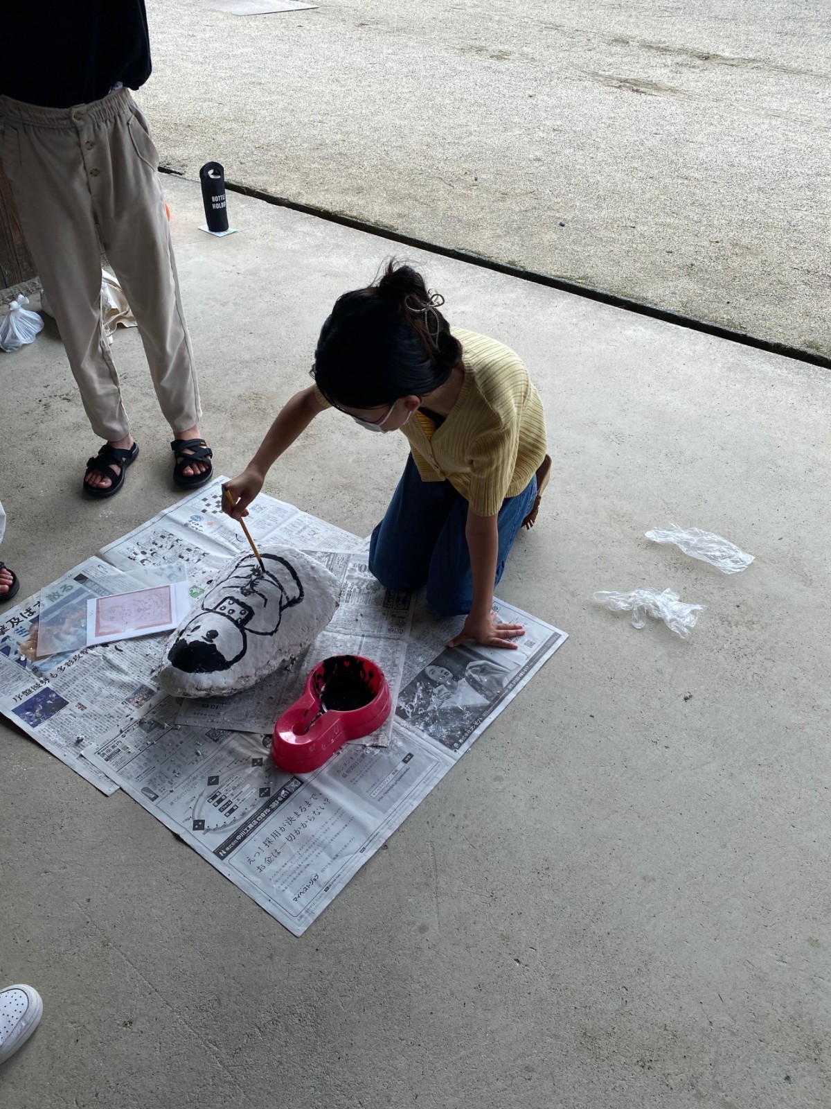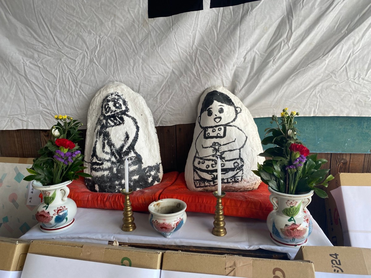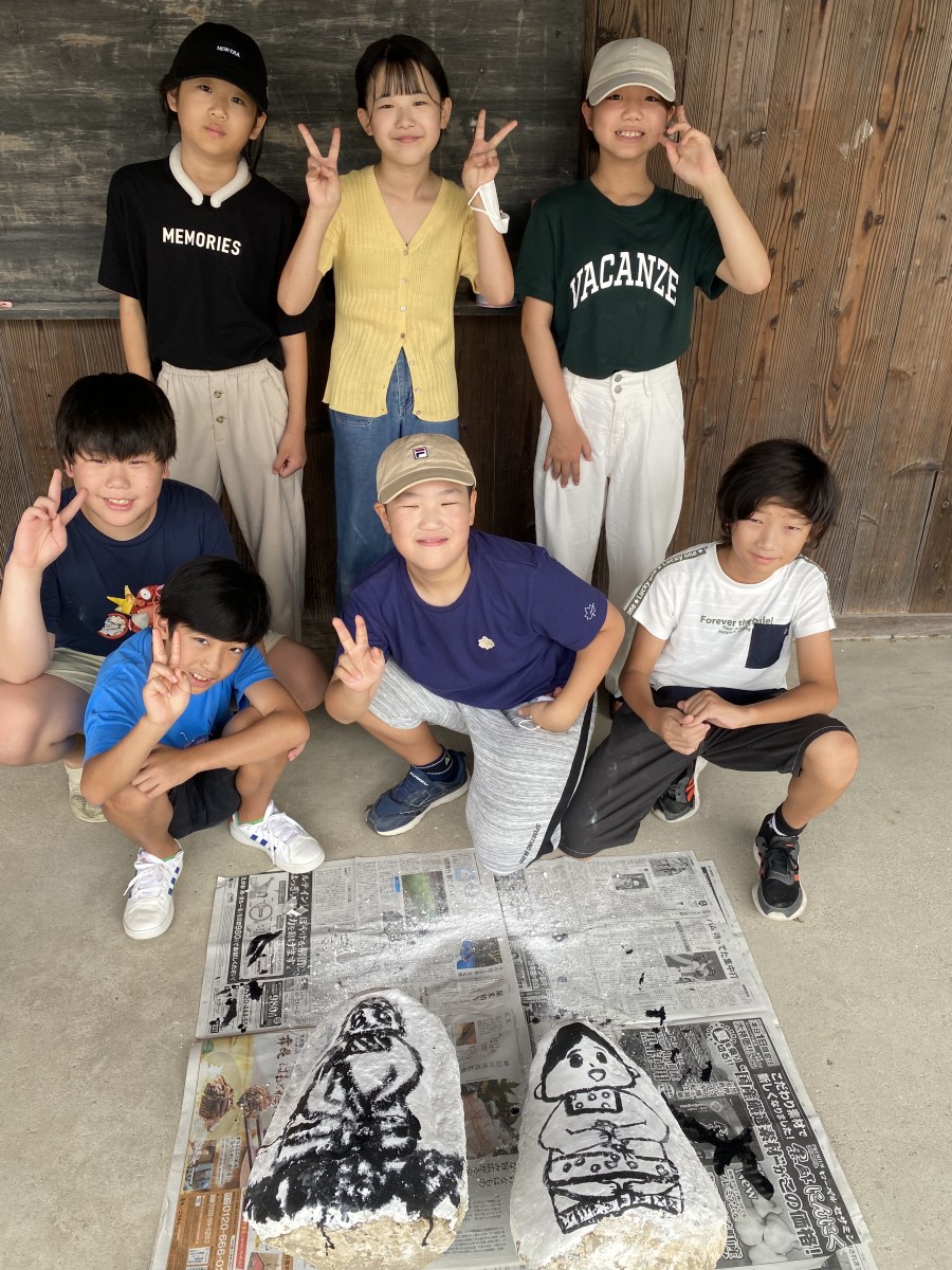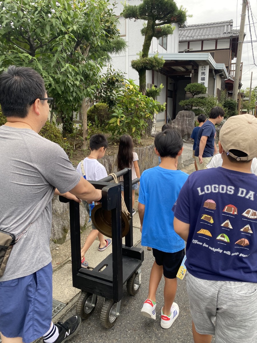 2日前から町内にお知らせする「ふれまわり」を行い、前日に 5.6年生がお地蔵さんのお化粧直しをしました。当日の朝からはお供えの受付や設営などをして、夕方からの地蔵盆の準備をしました。