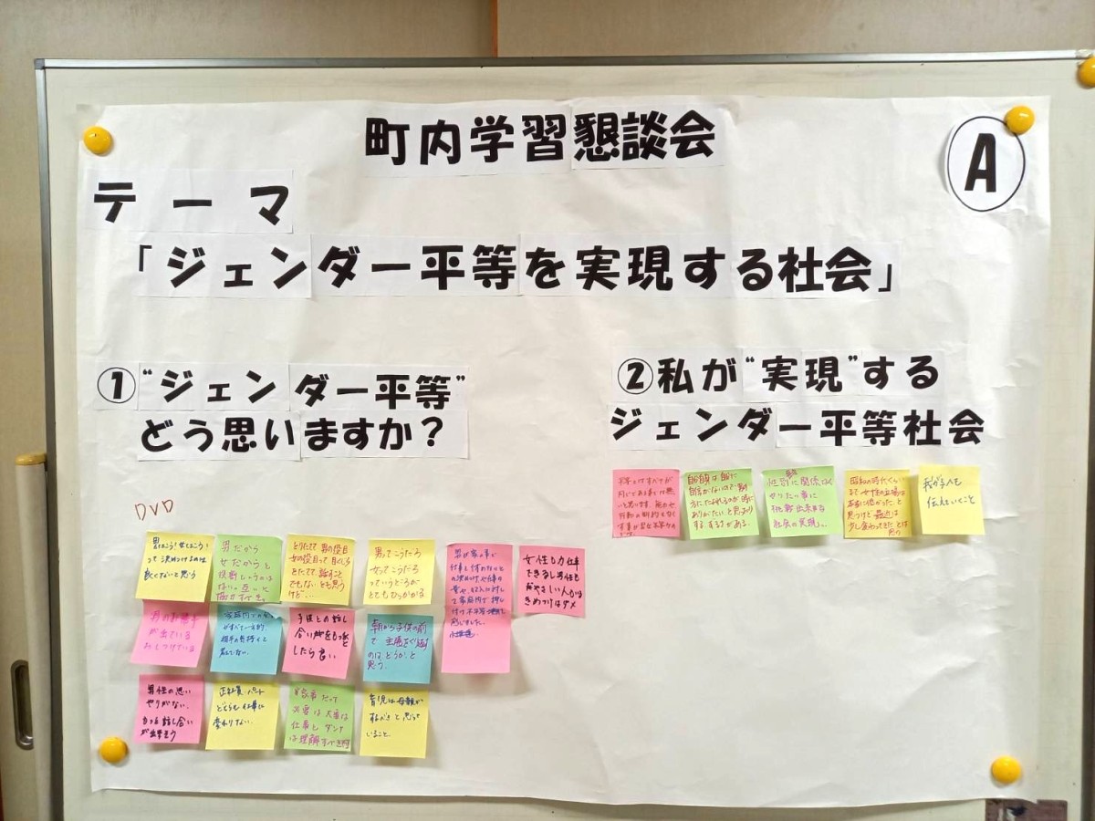 まずは、人権DVDを視聴し、その後、2グループに分かれてグループワークを行いました。人権DVDの内容は、とある夫婦の会話から「男女の役割」について問うストーリーでした。