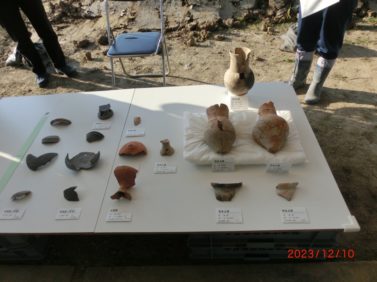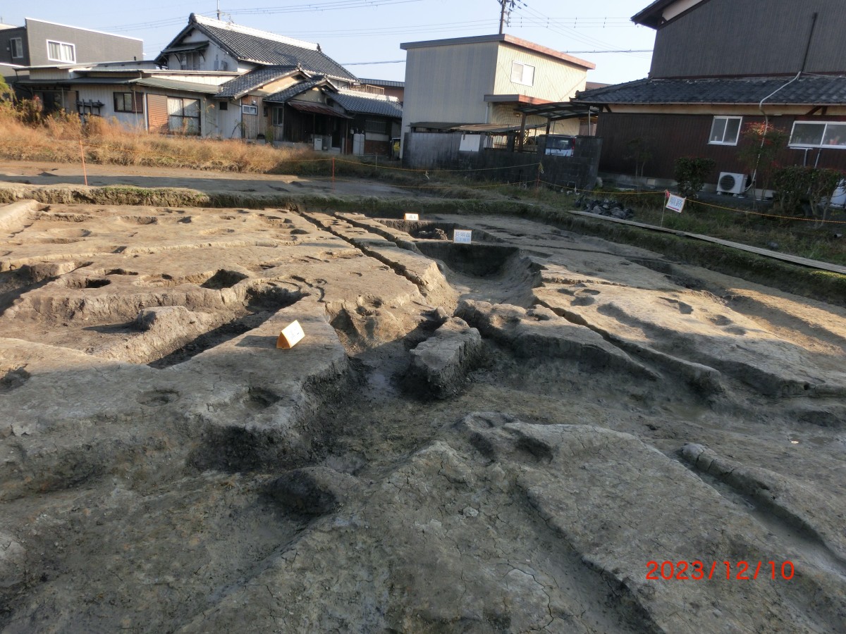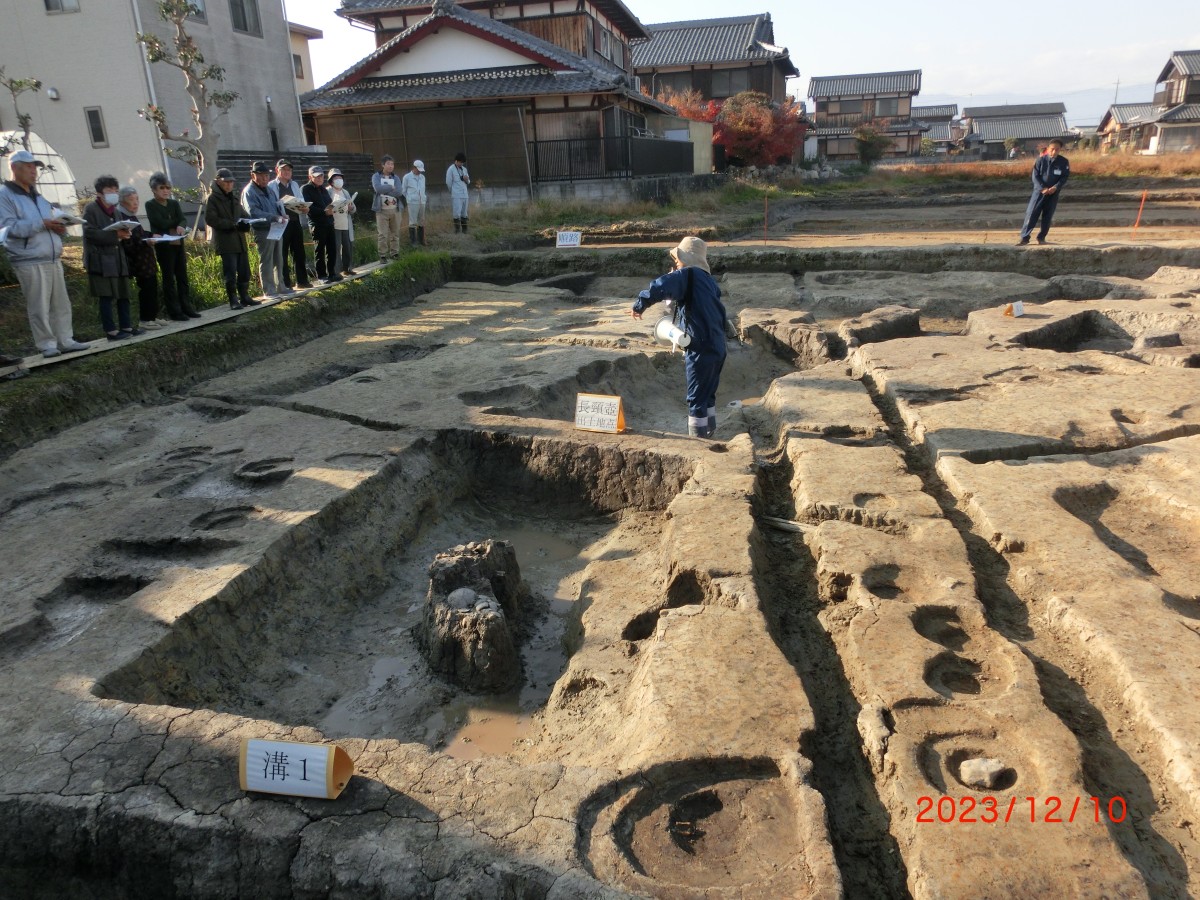 12月10日(日)、町内北東部「宮西遺跡」発掘調査の地元説明会に参加しました。この遺跡からは、今から2000年前の弥生時代から、500年前の室町時代にかけてのものとみられる建物跡や土器が見つかっています。町内の田んぼから遺構や土器が重層的に発掘されたことを聞き、今日まで続く我々の祖先の生活跡かも…?と驚きを隠せませんでした。