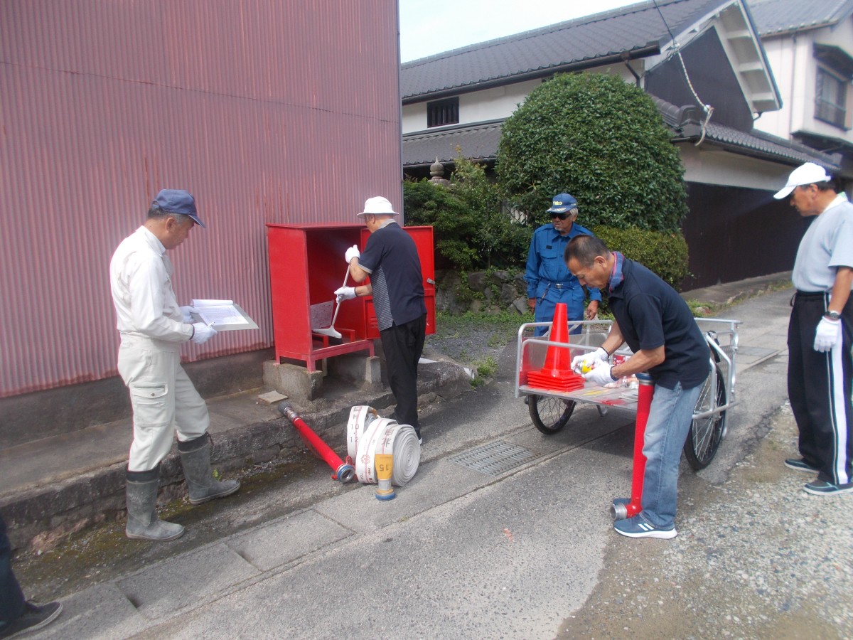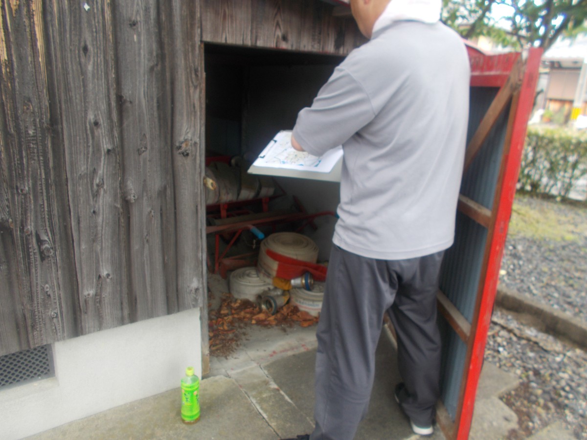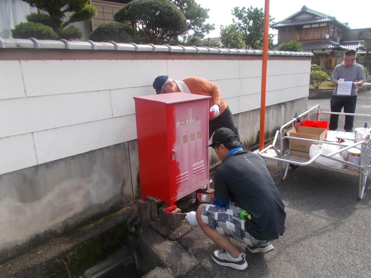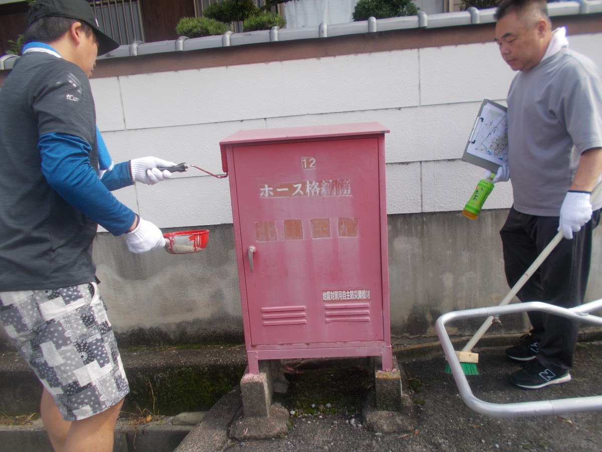 降雨が続く時節、7月13日は好天に恵まれ、北山田町の防災委員会では、委員さんによる「消防器具の点検および塗装」作業を実施しました。