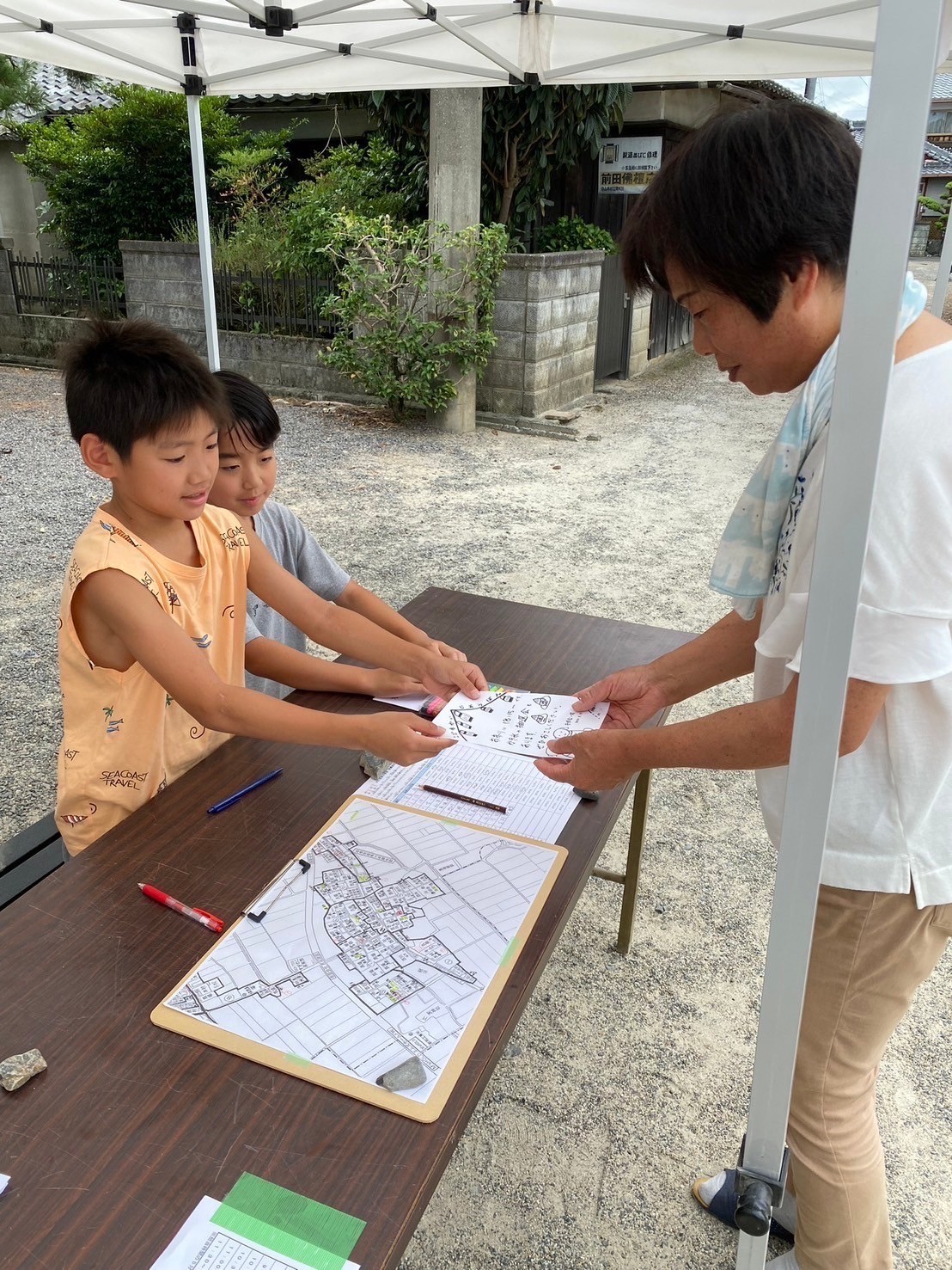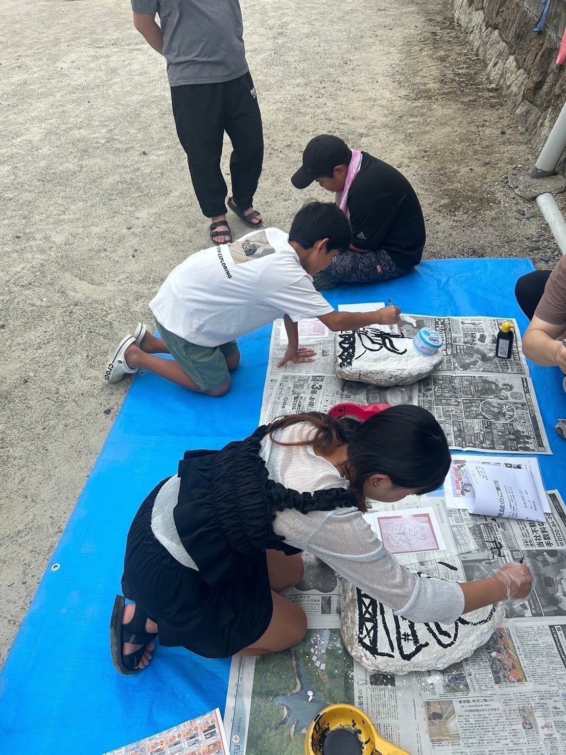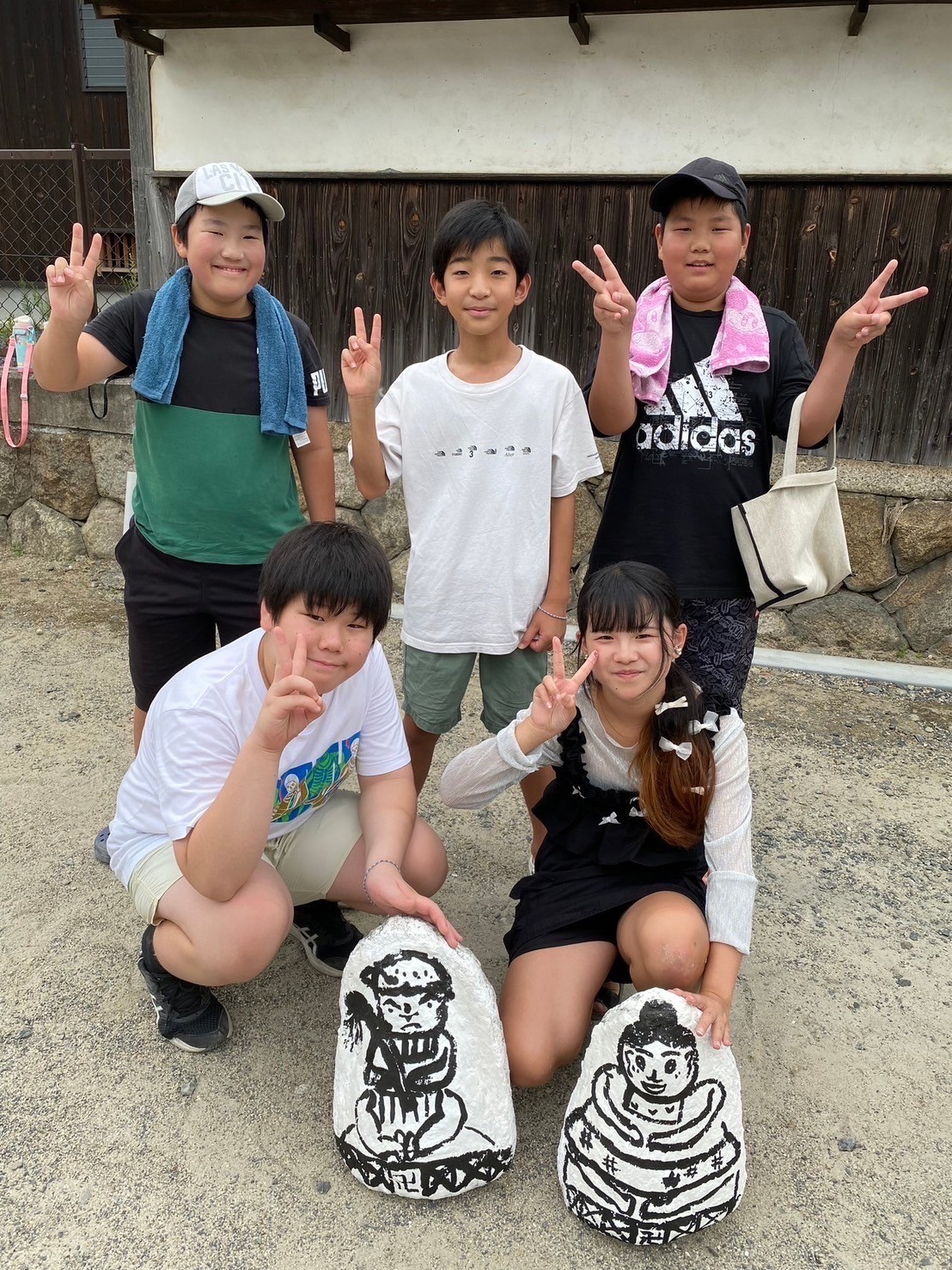 2日前から町内にお知らせする「ふれまわり」を行い、前日にはお地蔵さんのお化粧直しを5.6 年生で行いました。当日の期からは全員でお供えの受付や設営をし、夕方からの地蔵盆に備えました。