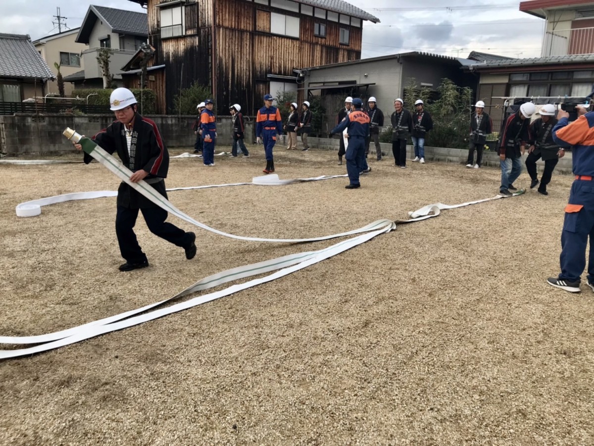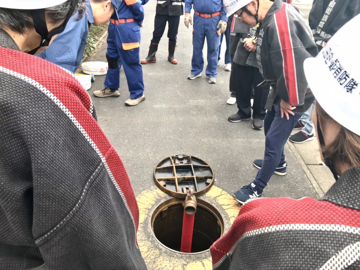 自衛消防隊と町内会合同で、震度5以上の地震時の安否確認と、水防訓練を