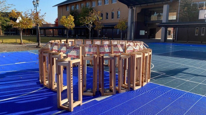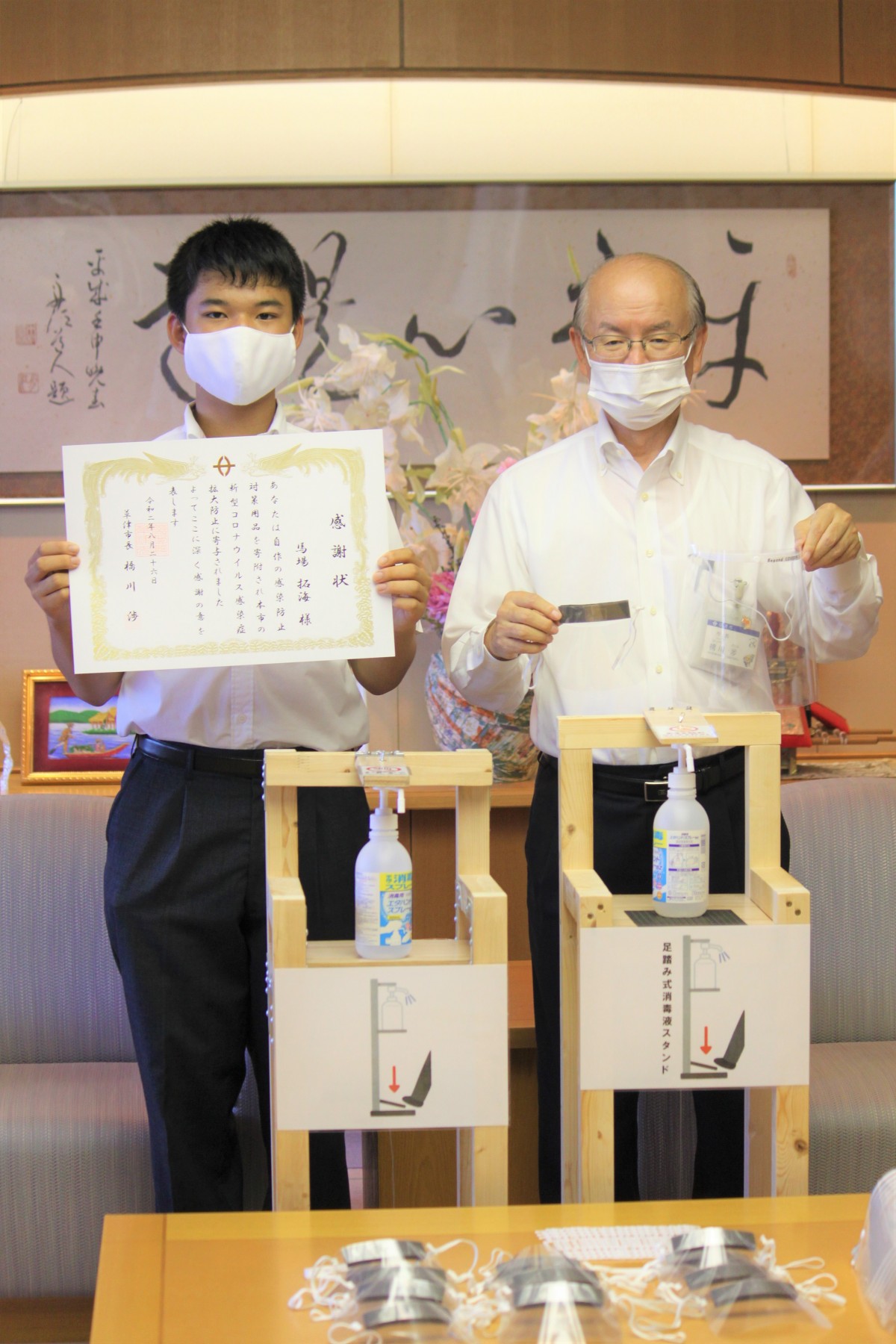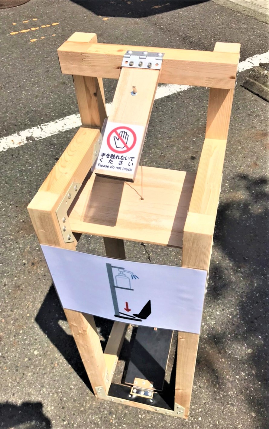 中3 馬場拓海君が自作の足踏み式消毒液スタンドを寄贈していただきました!