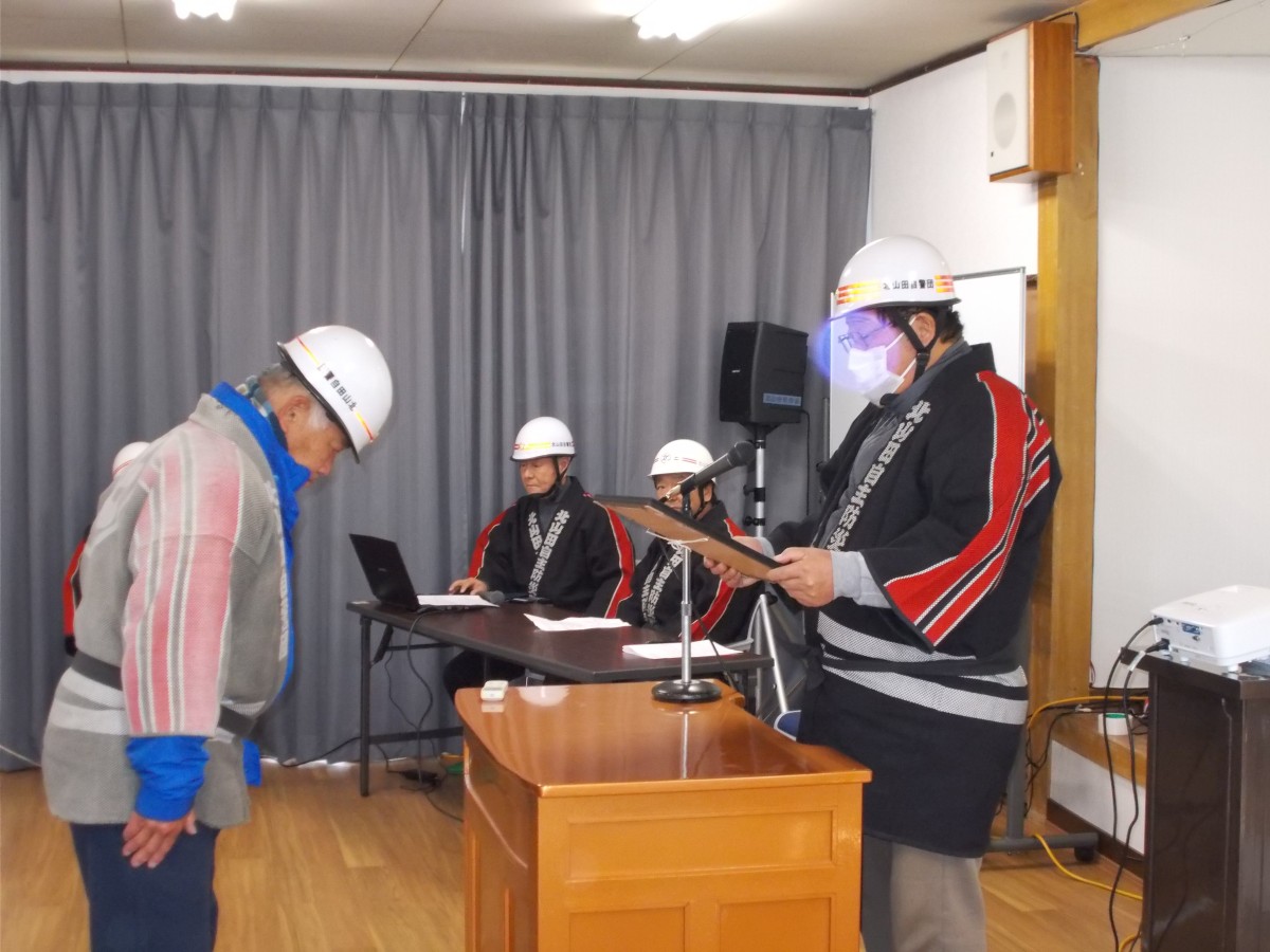 本町内では、毎年1月の第1日曜日に行っているもので、本年は、2部制とし、1部を会館において「式典」を式次第に基づき、「開式」、「人員報告」、「国旗掲揚」、町内会長並びに来賓の「挨拶」、草津市の優良防災個人表彰者への「表彰伝達」を行った後、放水訓練用のビデオを鑑賞し、防災委員長からの説明があり、1部を終了いたしました。