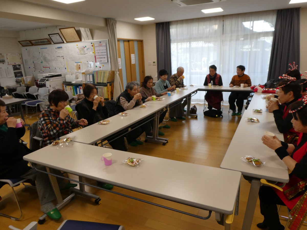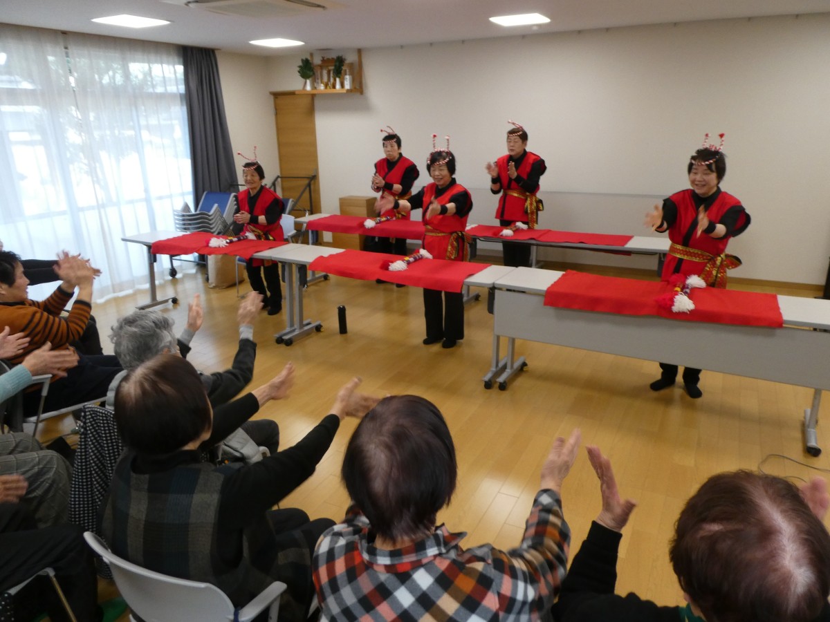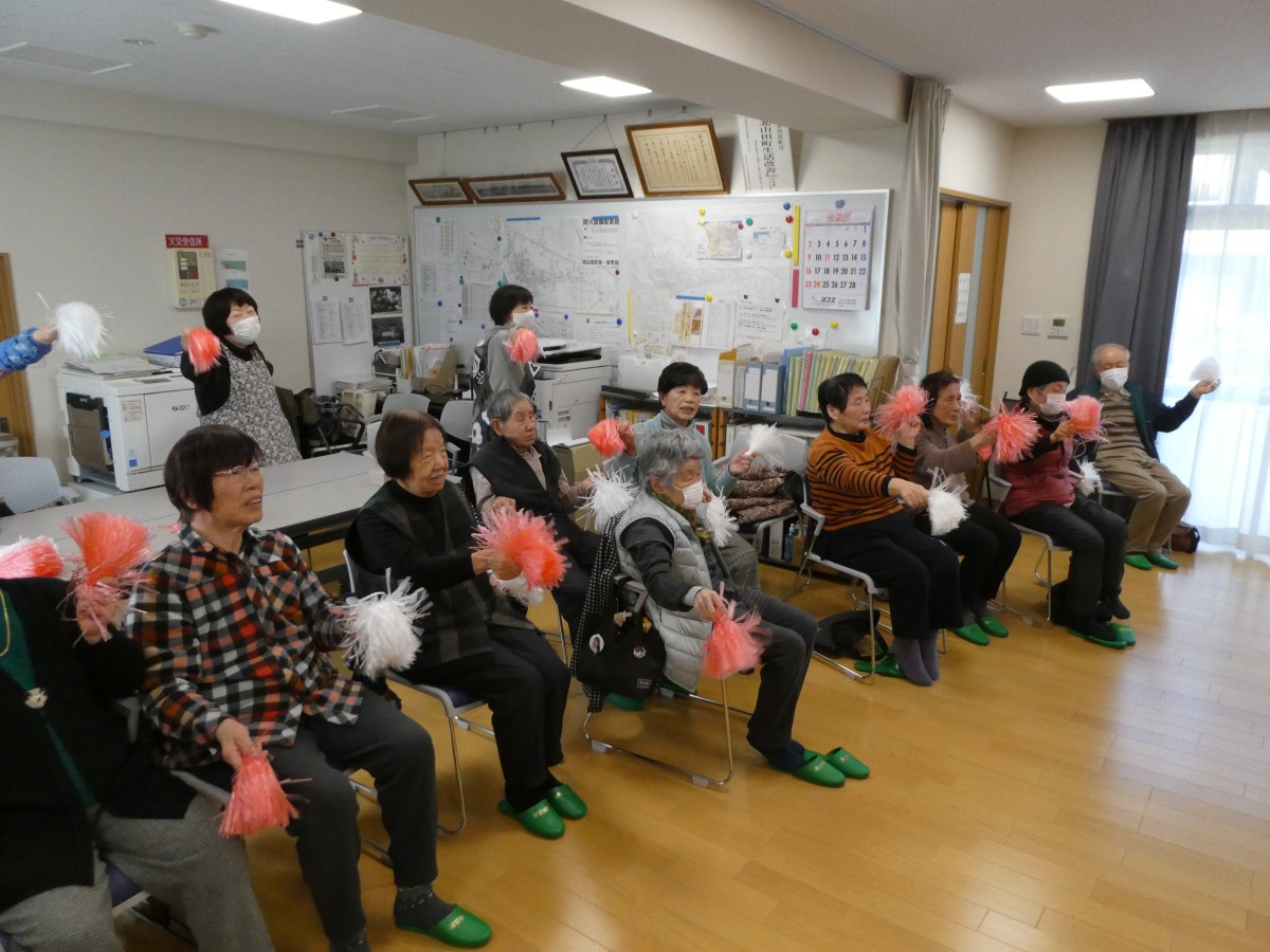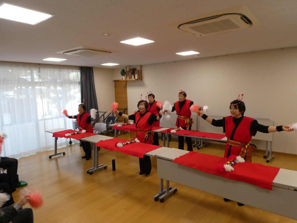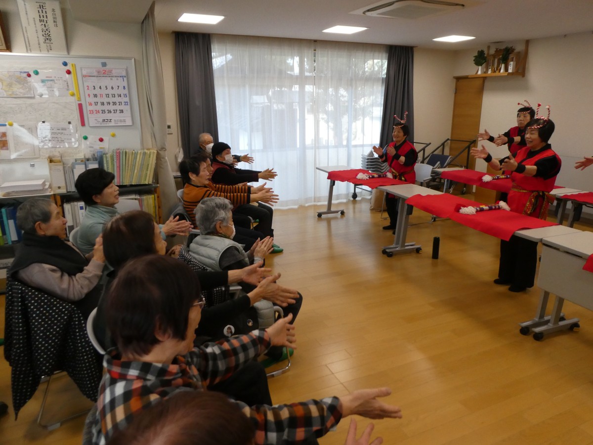 北山田ふれあいサロンでは、月1回、毎週火曜日に行っている「いきいき百歳体操」のあと、ゲストボランティアの皆さんによる多彩な催しが組まれております。 2月25日(火)の午前には、「JA銭太鼓(ぜにたいこ)同好会」の5名のメンバーの皆さんにより、おめでたい席で披露される「銭太鼓舞踊」を演技していただきました。華やかな衣装をまとい、参加者のよく知っている民謡や歌謡曲のリズムに合わせて、両手に持った「銭太鼓バトン(コインを中に入れたバトンで、振るとお金の音が響きます。)」を巧みに操り、参加者も途中で参加させていただきながら、元気で笑顔あふれる楽しい時間を過ごしていただきました。