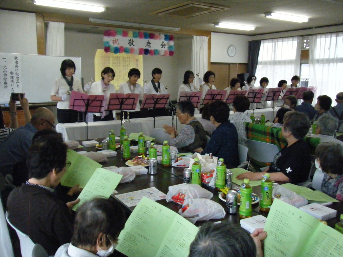 北山田町では、6月15日に敬老会を開催し、出席者は57人でした。プログラムは、子ども会1~3年生による「幸せなら手をたたこう」、参加者による「カラオケ」・長安寺老僧によるありがたい老後の話「いかに楽しく長生きするか」・町内ボランティアグループによる「みんなで歌おう」と「リズム体操」、さらに初めての演目として、笑交亭爆笑さんによる「落語」やYMBC(山田・民児協・ベル・クラブ)さん11名によるハンドベル、JAカルチャースクールの皆さんによる銭太鼓を披露していただきました。また、山田交番による「特殊詐欺防止について」の防犯教室では、犯罪に巻き込まれないための心構えなどについて教えていただき、参加者からの多くの質問が出され、一つずつ丁寧に答えていただきました。最後の演目の踊りの会による「踊り」では、きれいな着物姿で華やかな舞を披露いただき、とても楽しい一日を過ごせました。最後の「お楽しみ抽選会」では、寄付などの景品をもらって、たいへん喜んでいただきました。来年も今年以上の参加者を迎え、スタッフ一同頑張りますと心に誓い、無事敬老会を閉じることができました。