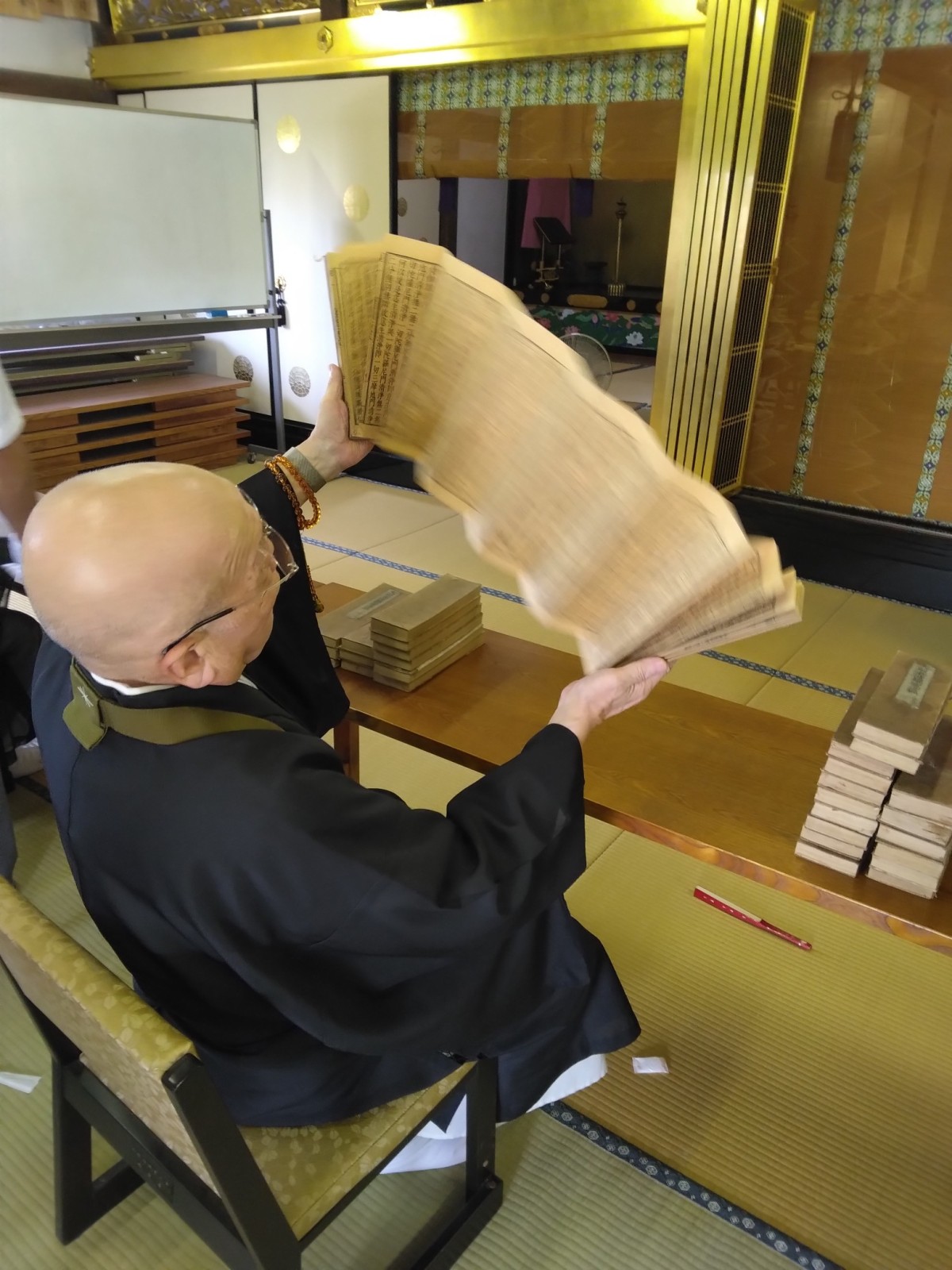 現在は町内4ヵ寺が預かり7月に当番寺に持ち寄りお経を唱えながら教本に風を当て、防虫剤を入れ替えています。今年は7/12(土)10時から西念寺様で4ヵ寺の和尚様と奉賛会役員で執り行いました。