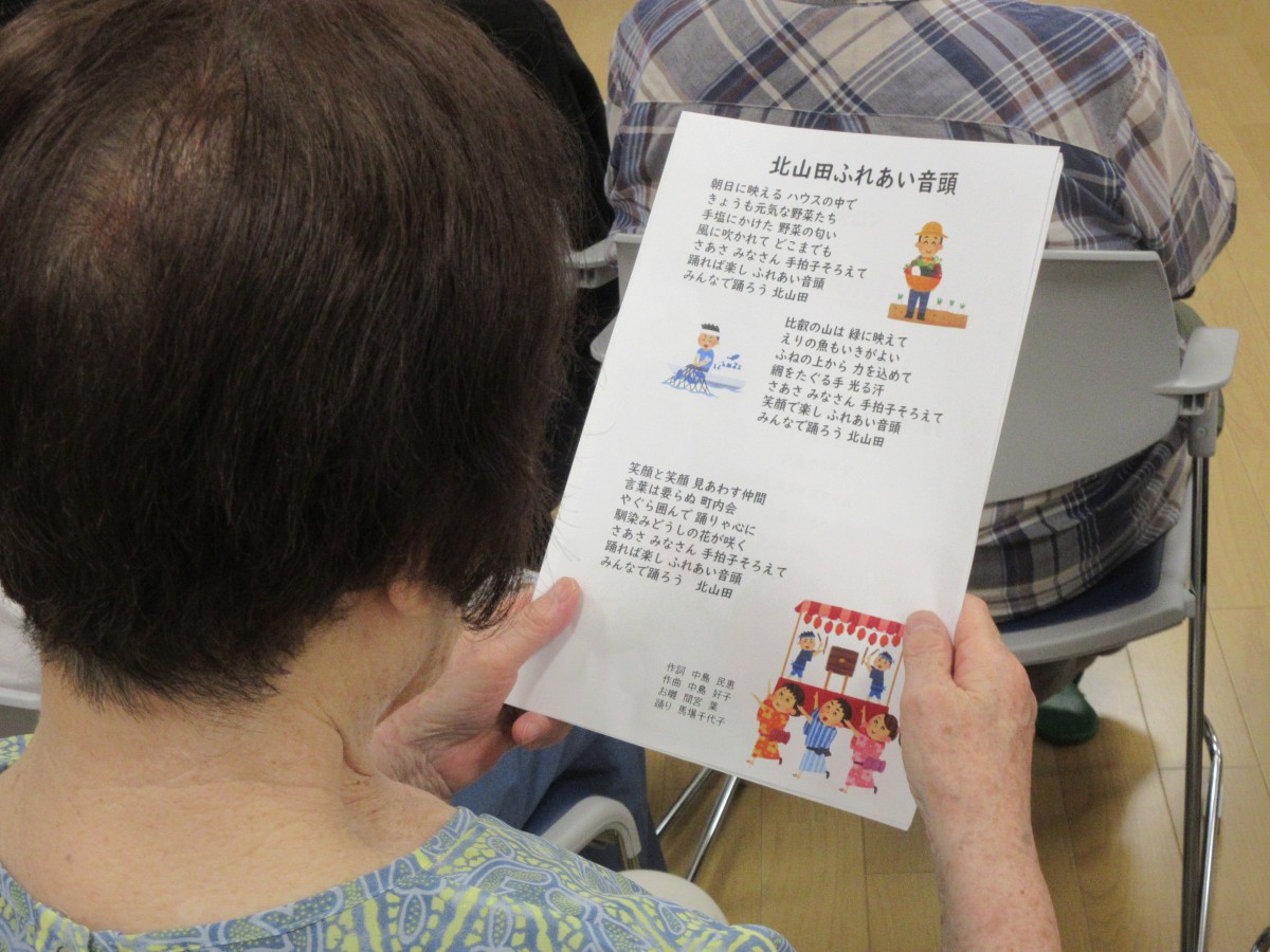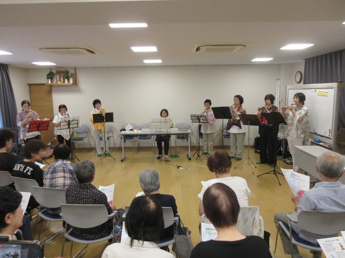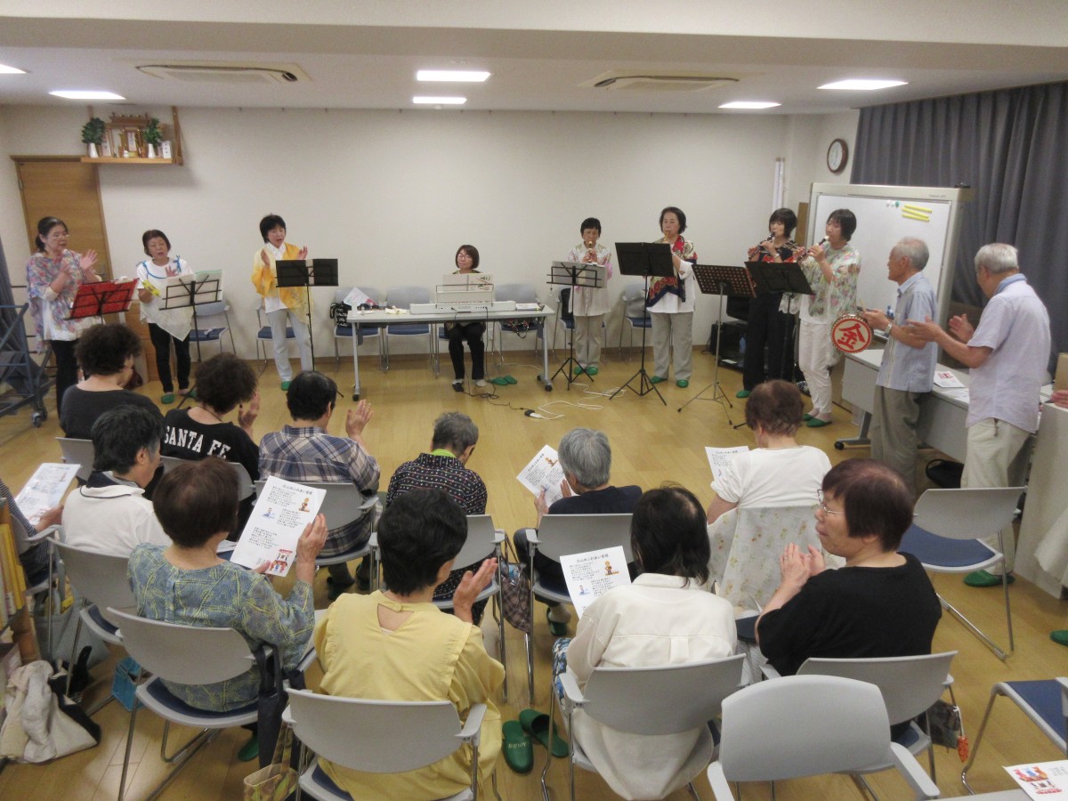昔懐かしい曲を主体に、数曲の演奏のあと、リコーダー演奏によりみんなで歌を歌い、その曲の歌詞に出てくる「色」を当てるクイズ、そして最後に「北山田ふれあい音頭」を披露していただき、参加者全員元気で笑顔あふれる楽しい時間を過ごしていただきました。