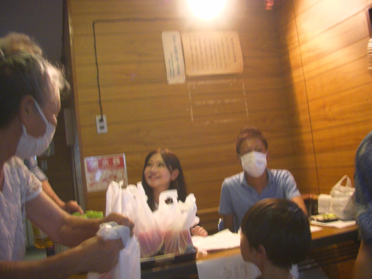 ↑受付で町内会会員が育てて提供してくださったスイカをお渡ししている様子。本当は『スイカ割り』をする予定でしたが、