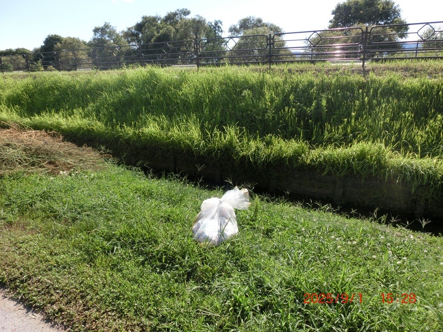 湖周道路沿い水路にほかされていた。袋に入っている水が抜けるまで回収はできません