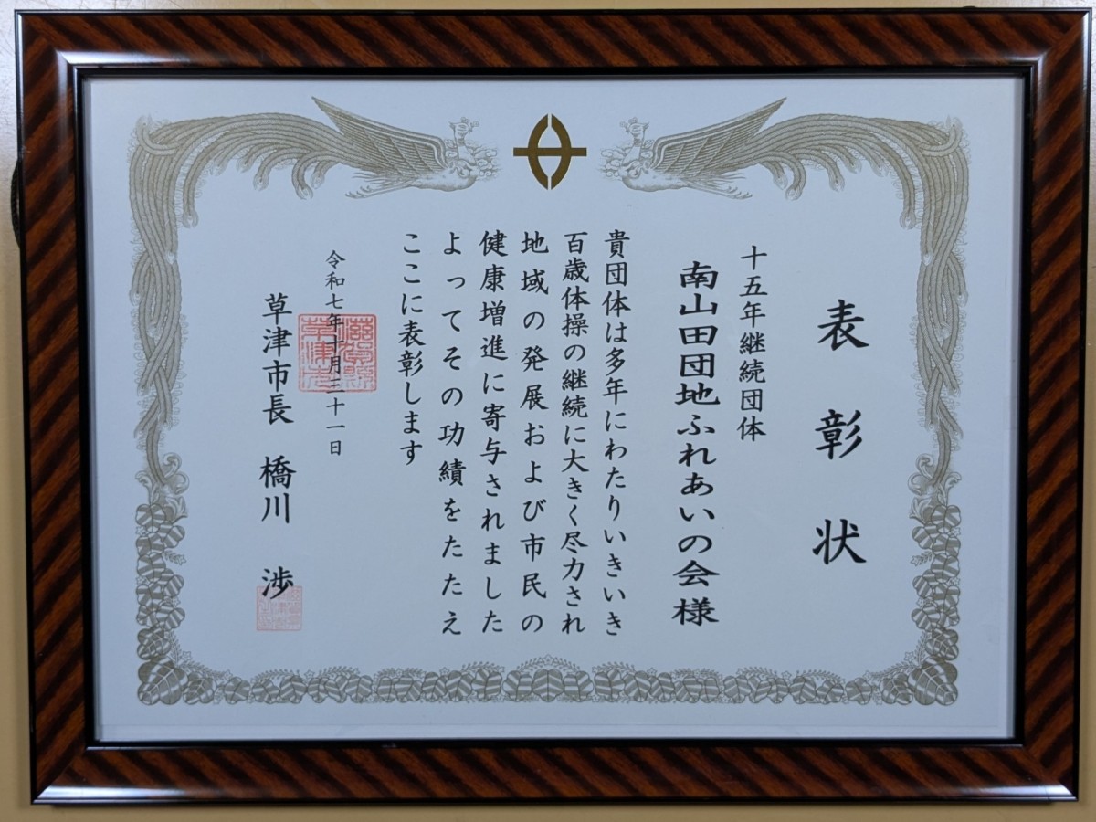 最後に、草津市長 橋川渉様より、南山田団地町内会独自活動、『ふれあいの会』を表彰いただきました(^^)v